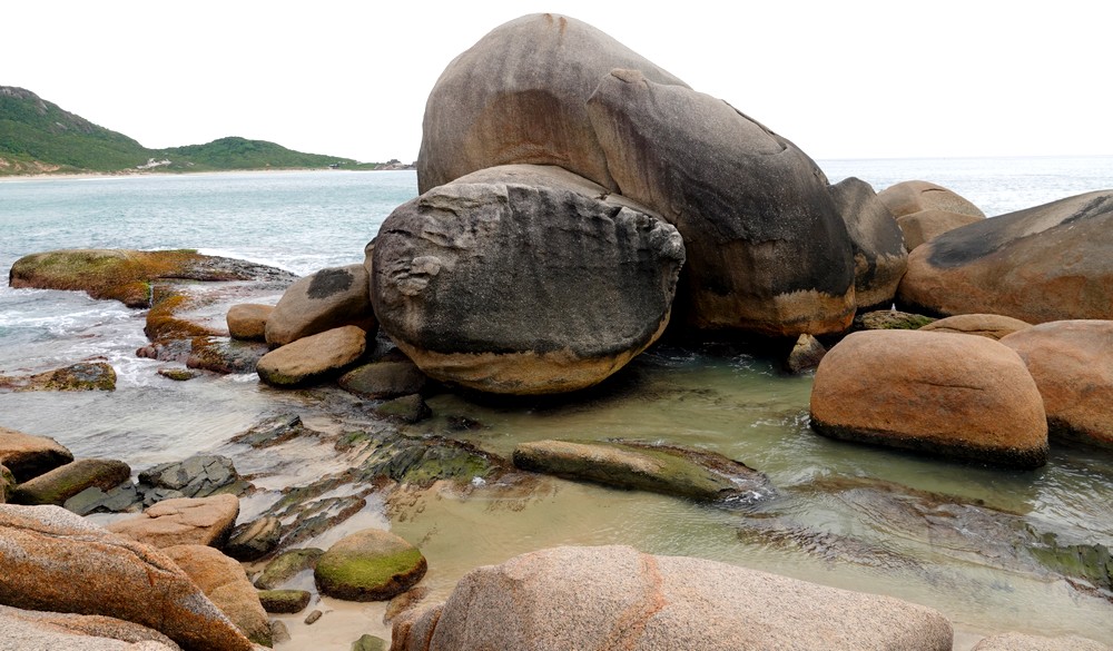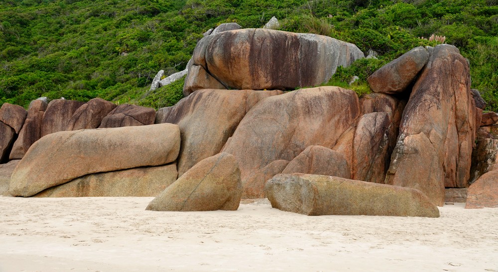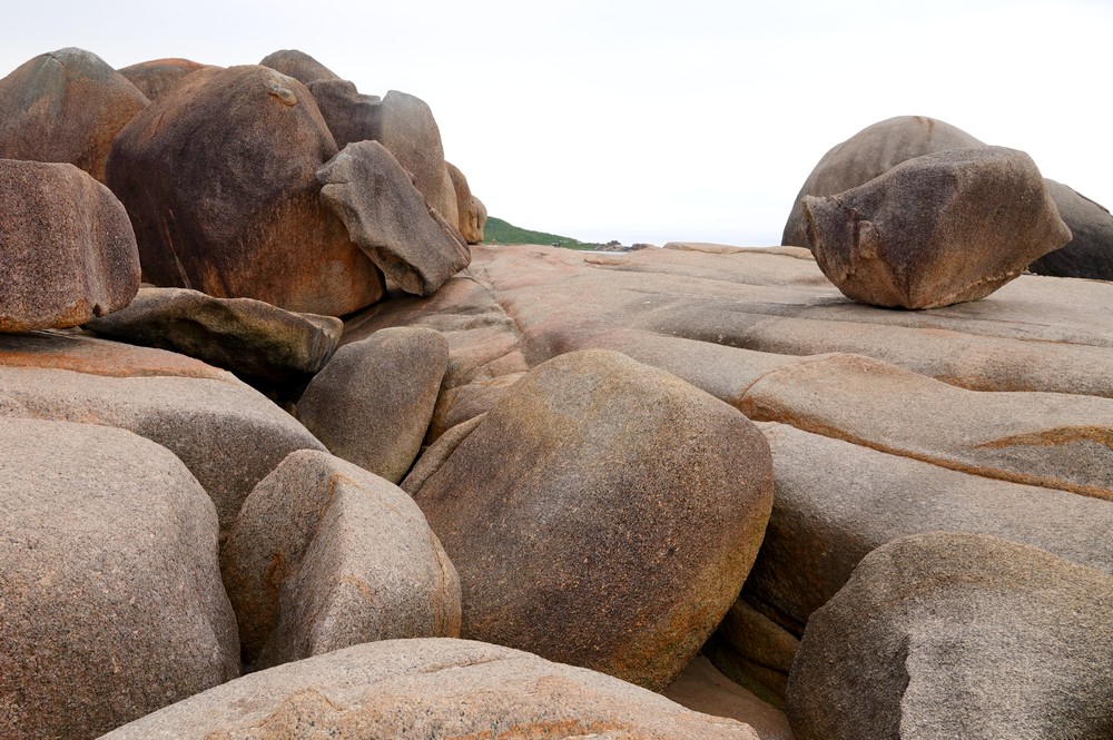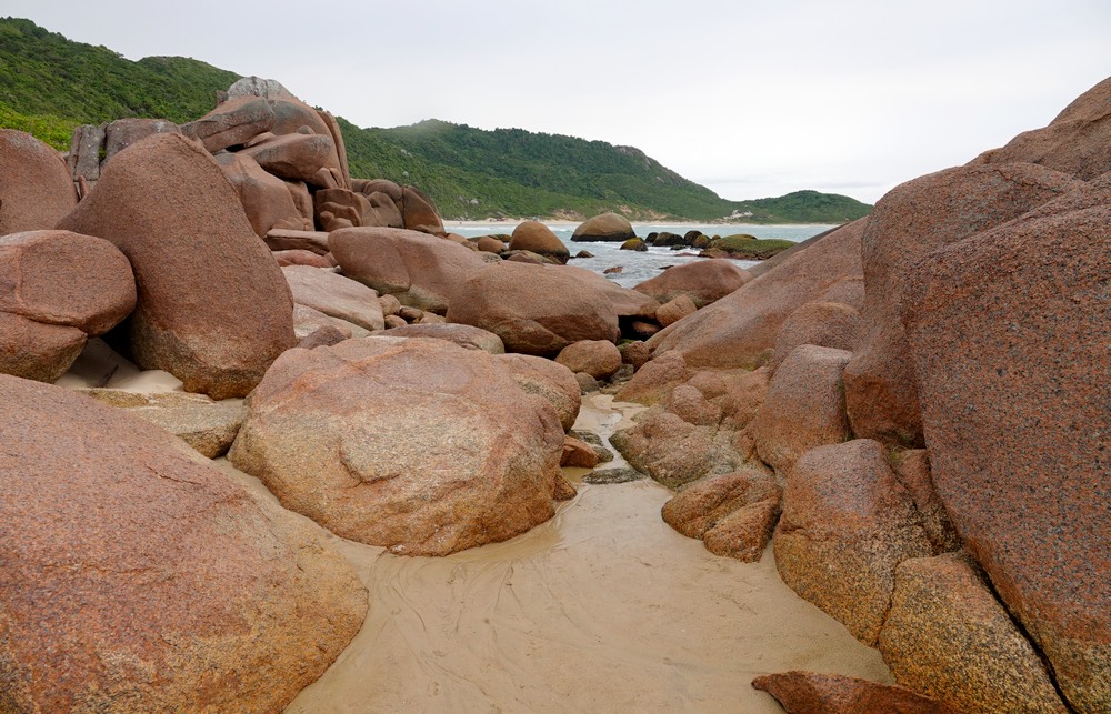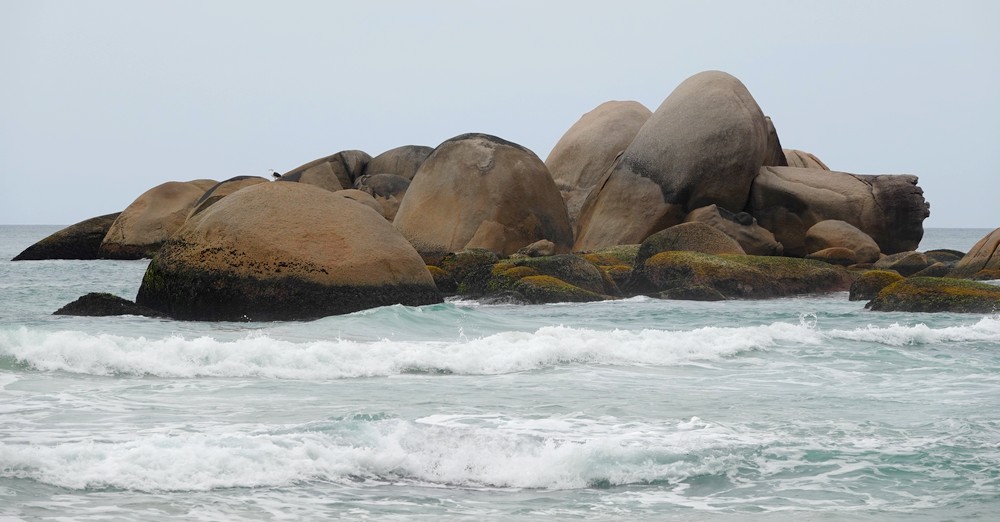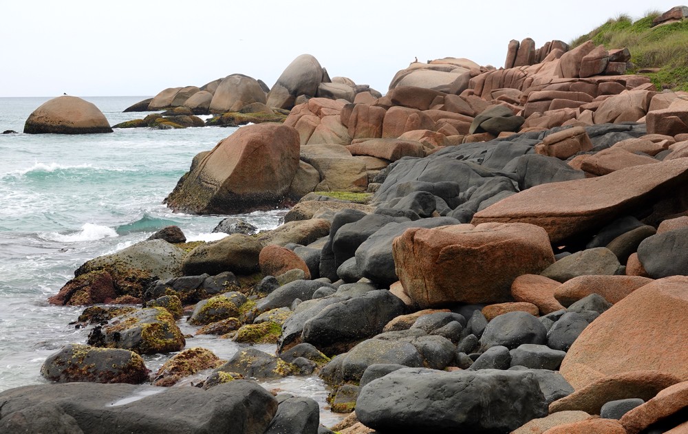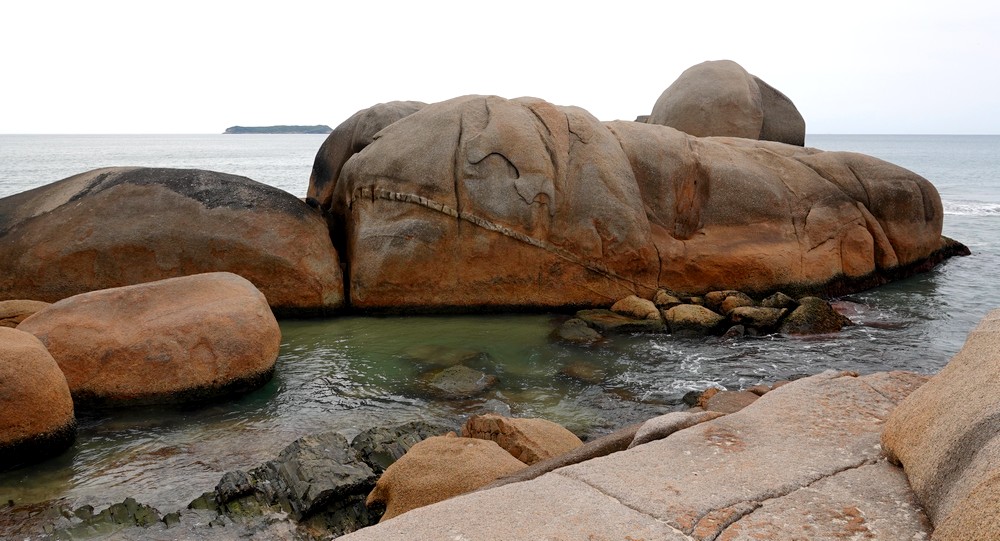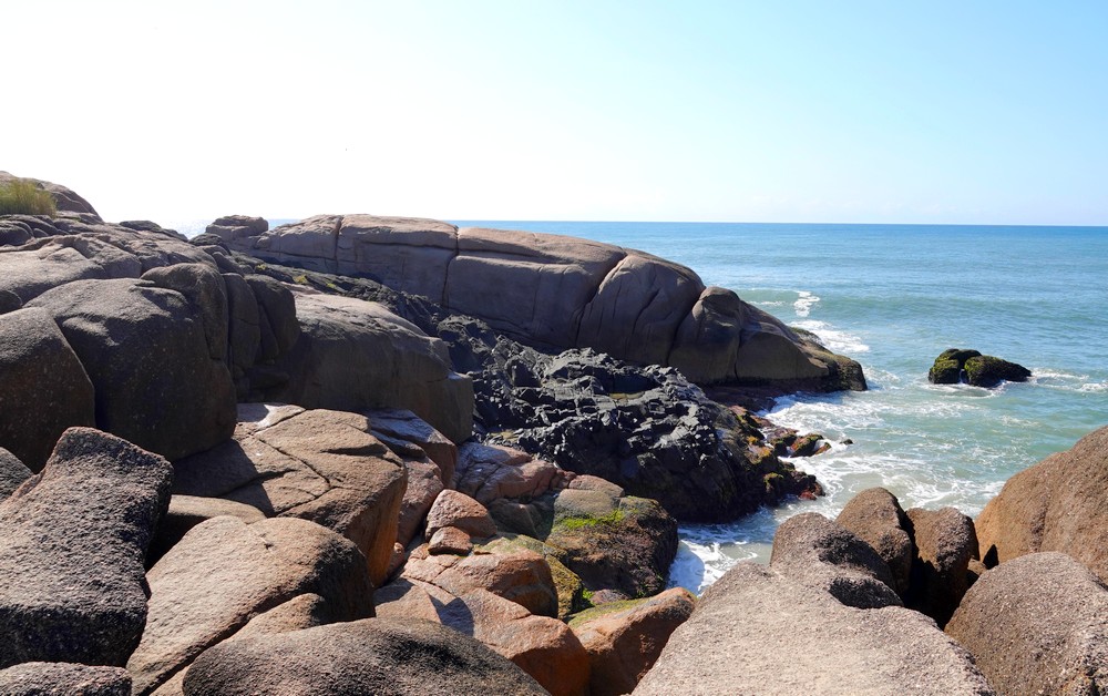 Comme ici encore, la baignade peut s’avérer dangereuse, nous nous contentons de marcher sur les gros rochers de granit rose – on se croirait en Bretagne – parfois entrecoupés de coulées de basalte.