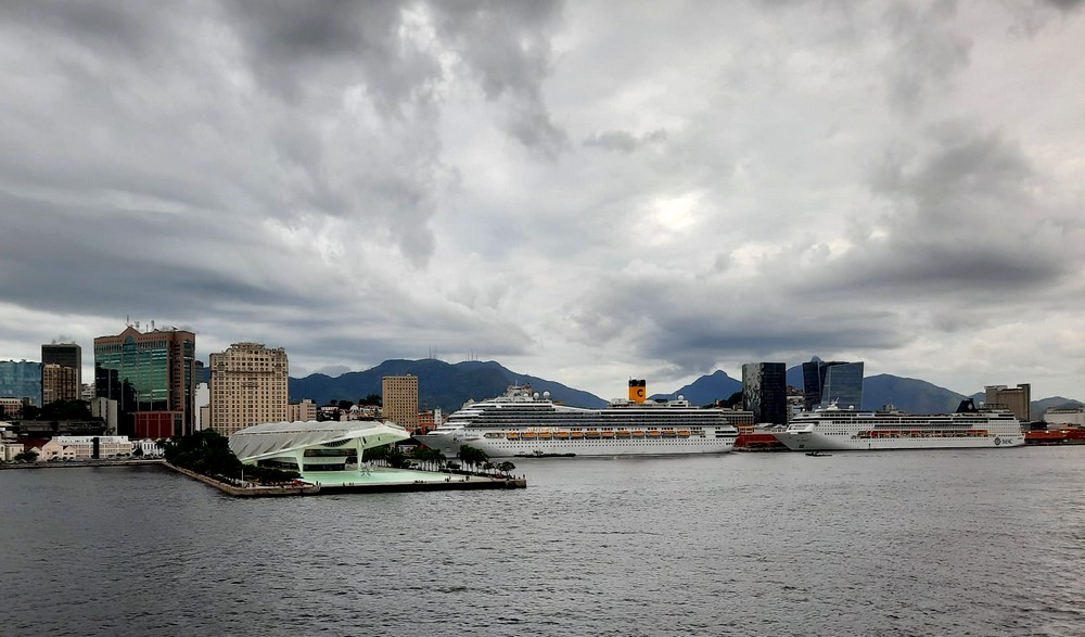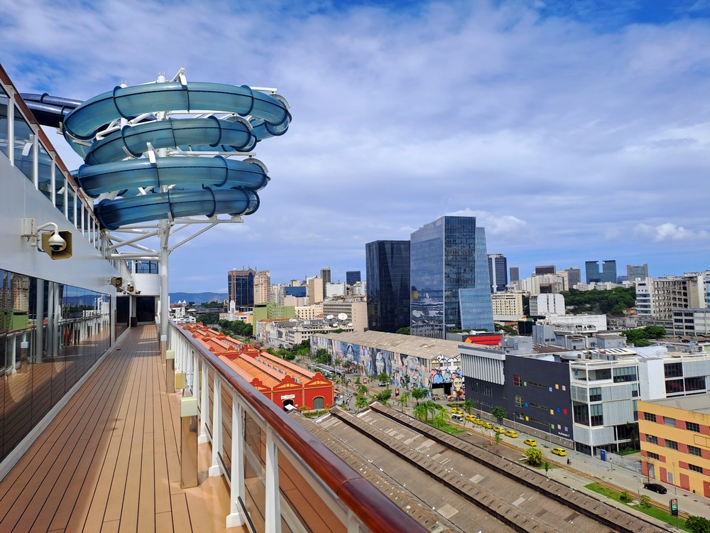 En début de matinée nous partons de l’hôtel Vila Galé en taxi pour nous rendre à la gare maritime. Cette ultime traversée de Rio nous donne ainsi l’occasion de repasser dans de nombreuses ruelles du Centro, le GPS de notre chauffeur ayant décidé d’expérimenter un itinéraire bis évitant toute les grandes artères ! Dans la foulée, MSC n’ayant pas correctement localisé le lieu exact où déposer les bagages, nous prenons une dernière transpirée brésilienne en tirant nos gros sacs sur quelques centaines de mètres – heureusement, ça roule bien, il n’y a pas de pavés ! Une fois les bagages enregistrés, il nous reste à retourner vers le hall d’embarquement qui, évidemment, ne se situe pas au même endroit – et hop, on repart en arrière, mais cette fois, on est largement allégés ! Les formalités sont rapides – même si à trois reprises on nous réclame le test négatif du Covid, véritable sésame pour récupérer enfin la carte de notre cabine. Quelques pas plus loin, nous rejoignons le quai et nous retrouvons face au monstre – oups, je voulais dire face au MSC Seaview ! Il faut dire que ce bateau est impressionnant, tant par sa taille que par son architecture extérieure légèrement difforme et peu esthétique quand on le regarde depuis l’arrière. (pour ceux qui ne seraient pas intéressés par le bateau et la vie à bord, le détail en images de nos escales se trouve en milieu de page)