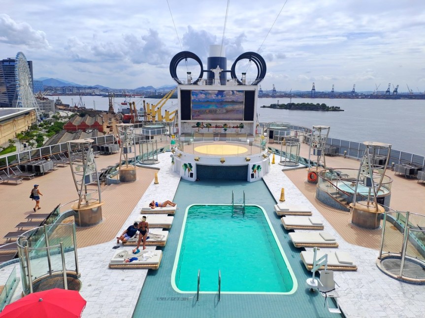 Avant de pouvoir récupérer notre cabine – ce n’est possible qu’à partir de 14h – nous commençons à explorer les différents ponts, puis nous déjeunons au buffet, le restaurant n’étant jamais ouvert le midi le jour du départ.