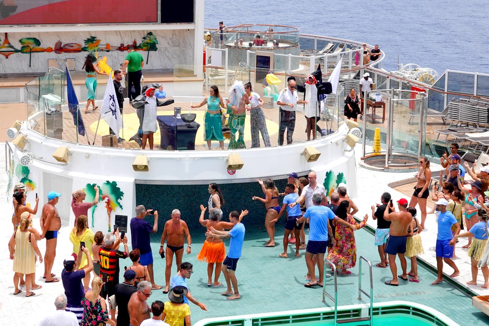 Comme à chaque traversée, le passage de l’équateur donne lieu à une grande fête sur le pont supérieur du bateau pour célébrer l’évènement où le dieu Neptune arrose d’abord copieusement les participants avant d’ordonner qu’ils soient aspergés de farine, tomates, chocolat en poudre, œufs et yaourts. Une coutume assez surprenante qui se termine par un plongeon collectif dans la piscine… Du haut de notre pont 18 où nous observons la scène au sec, je dois avouer que ce rituel nous laisse un peu dubitatifs !