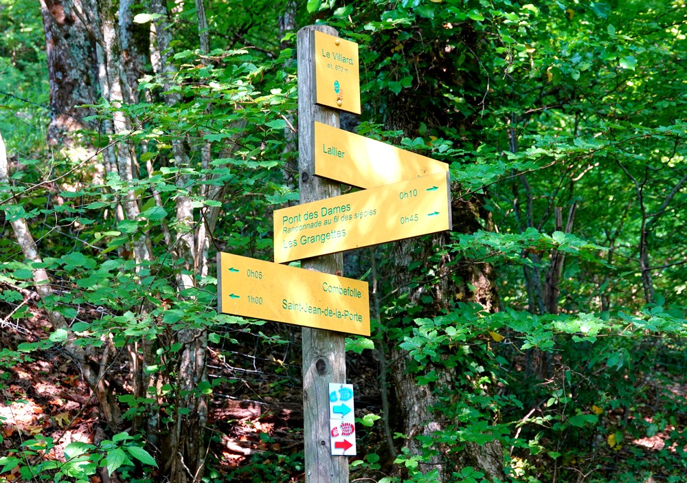 - Circuit à pied intitulé « Randonnade au fil des siècles », 9.5km, 500mD+, 4h avec les pauses. Fléchage assez discret (nous avons pris le circuit à l’envers donc les panneaux sont moins visibles) mais l’itinéraire est assez intuitif (depuis Les Grangettes, suivre Pont des Dames puis Combefolle et Saint Jean de la Porte).