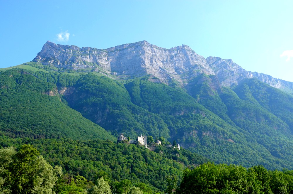 Au retour, nous prenons un peu d’altitude en empruntant la D201, une route peu empruntée qui, avant la création de la piste cyclable, était l’itinéraire préféré des cyclistes car elle traverse les vignes et les villages, et passe très près du beau château de Miolans. Construit au XIe siècle sur les vestige d’un oppidum ou d’une forteresse romaine – l’ancienne voie romaine reliant Lyon à Aoste en Italie passait non loin de là – au fil du temps, le château fut agrandi par la famille Miolans qui resta propriétaire des lieux jusqu’en 1523. La forteresse revient ensuite au Duché de Savoie et est transformée en prison d’Etat jusqu’en 1792, date à laquelle elle est en partie détruite par les troupes révolutionnaires françaises…