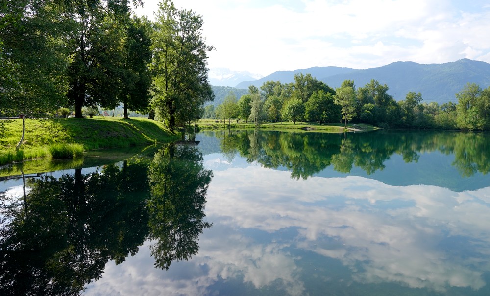 Au départ du camping, nous empruntons la piste cyclable qui file vers Albertville. Nous pédalons jusqu’à Sainte Hélène sur Isère, via le lac et la base de loisirs de Grésy sur Isère. Le parcours est vraiment facile car bien plat !