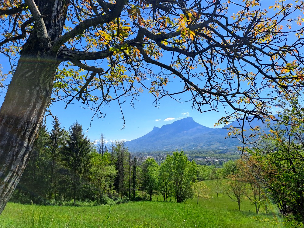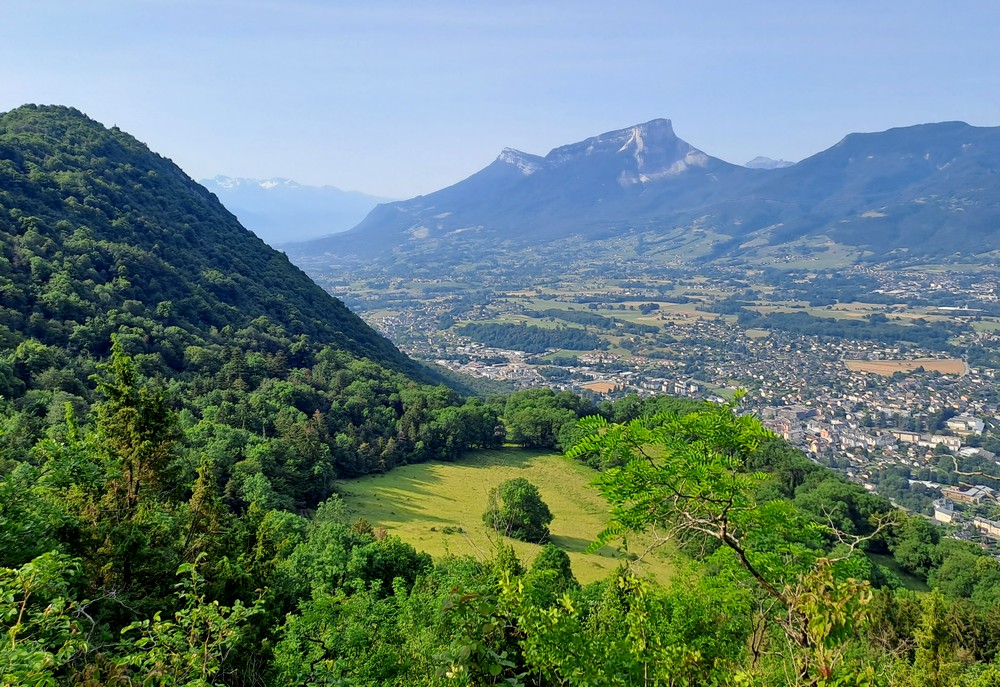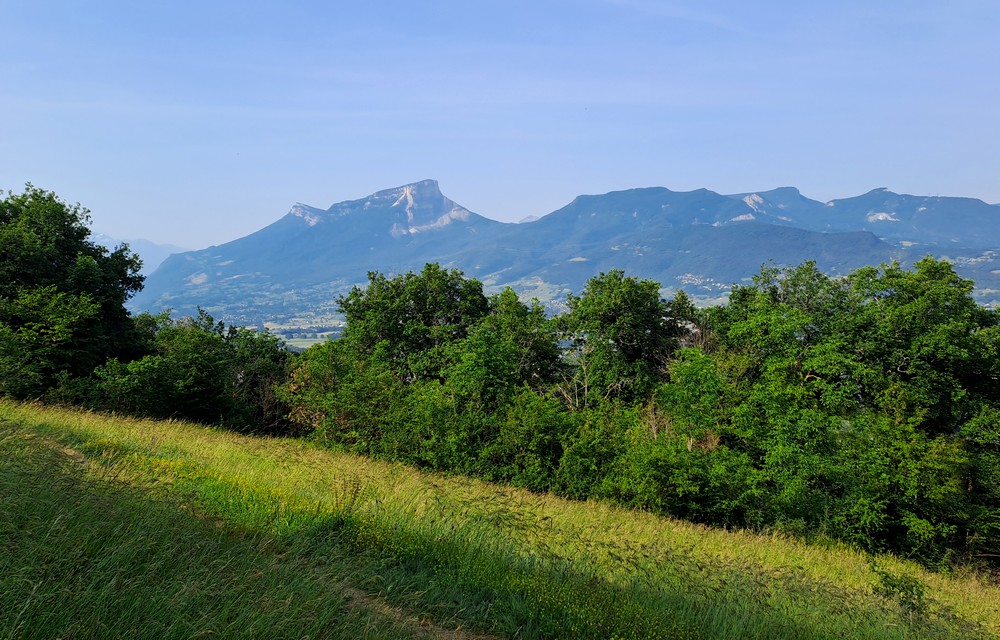 Cette dernière balade, qui nous fait de nouveau prendre de l’altitude, nécessite un bon coup de pédale ! Petite déception toutefois une fois arrivés au parc : on le trouve en triste état et peu entretenu. Et le chemin qui mène au belvédère étant fermé, nous n’aurons pas de vue plongeante sur Chambéry… On se console en redescendant jusqu’à la mairie de Bassens où là, le panorama sur la Croix du Nivolet est magnifique !