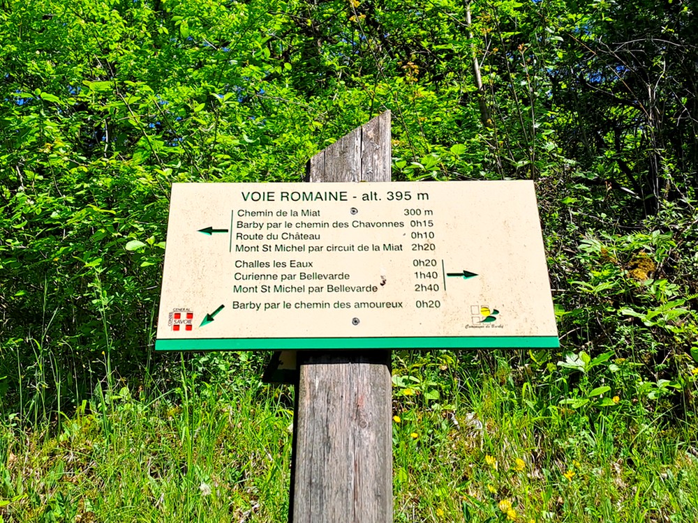 Un itinéraire facile, qui passe d’abord devant le Château des Comtes de Challes – c’est actuellement un très bel hôtel – et se poursuit en balcon sur une piste bien large – la voie romaine. Le parcours offre des vues somptueuses sur la Croix du Nivolet d’un côté, et le mont Granier en Chartreuse, de l’autre. La redescente sur Barby peut s’effectuer soit par le chemin des Amoureux, soit par une petite route peu fréquentée. A Barby, ne pas rater le beau Parc Malatray qui possède plusieurs beaux spécimens d’arbres. Et pour rejoindre le camping, il suffit de suivre d’abord la rue qui file vers Challes avant de bifurquer vers la piste cyclable des Planeurs, accessibles aux piétons.