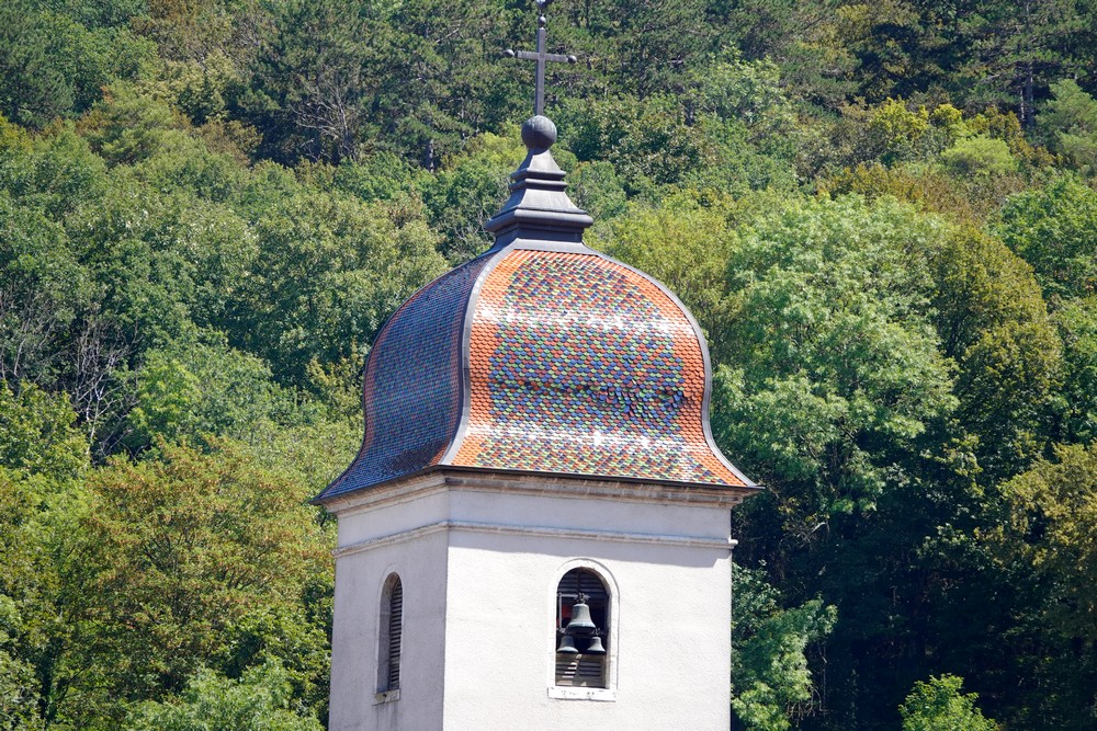 C’est sous une belle pluie que nous quittons Saint Point Lac et prenons la direction de Clerval, notre nouveau point de chute pour la semaine. En chemin, on s’amuse à repérer les clochers comtois recouverts de tuiles vernissées… et ils sont nombreux !