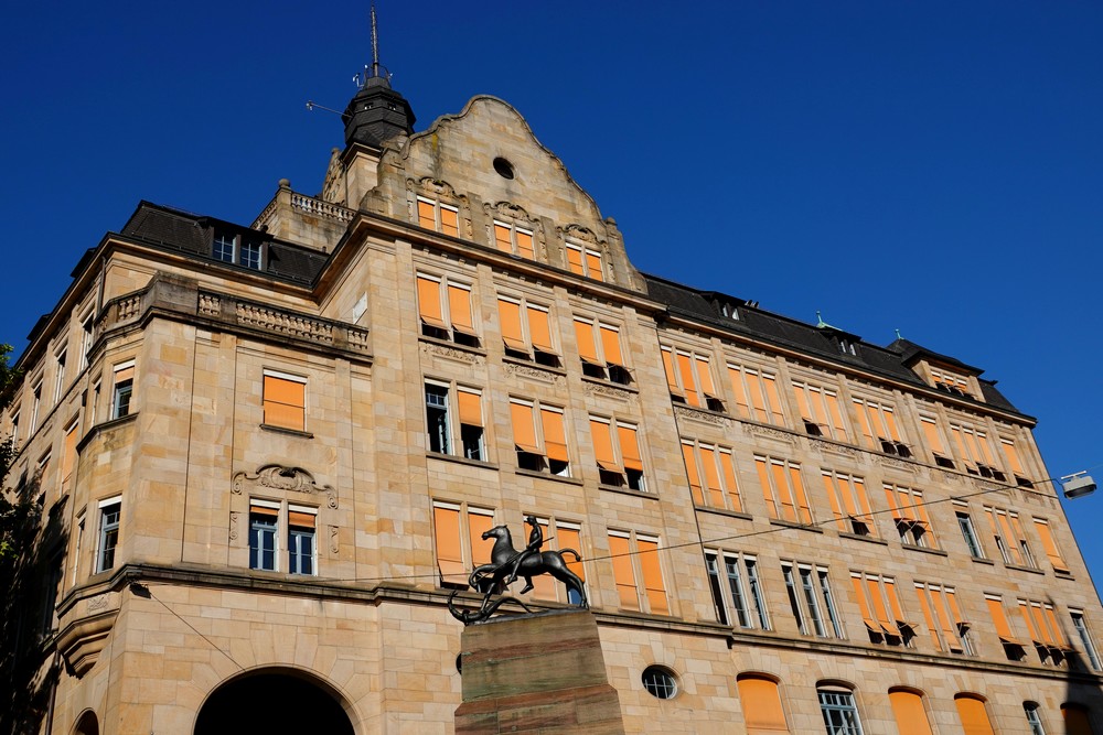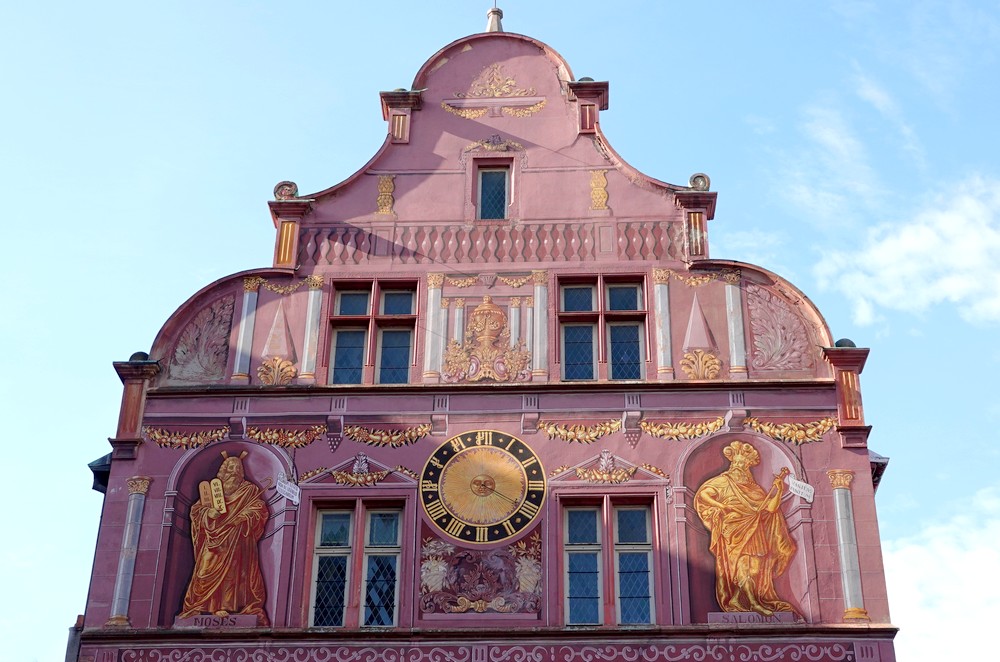 Nous arrivons ensuite au cœur de la vieille ville, et plus précisément devant le Basler Rathaus dont la façade rouge nous impressionne avec ses multiples peintures polychromes. Construit au XVIe siècle, l’actuel hôtel de ville domine la place du Marché ; il est aussi le siège du gouvernement de Bâle et du parlement.
