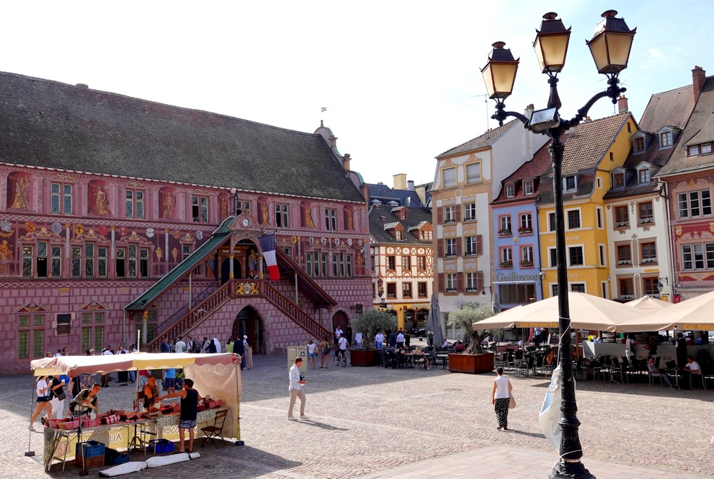 Après un arrêt chez Poulaillon pour déguster un bretzel au munster qui réveille les papilles, nous arrivons Place de la Réunion, ainsi dénommée après le rattachement de la République de Mulhouse à la République française, le 15 mars 1798. C’est assurément la plus grande et la plus belle place de la vieille ville, bordée par le temple Saint Étienne, l’Hôtel de Ville et de jolies maisons aux façades colorées !