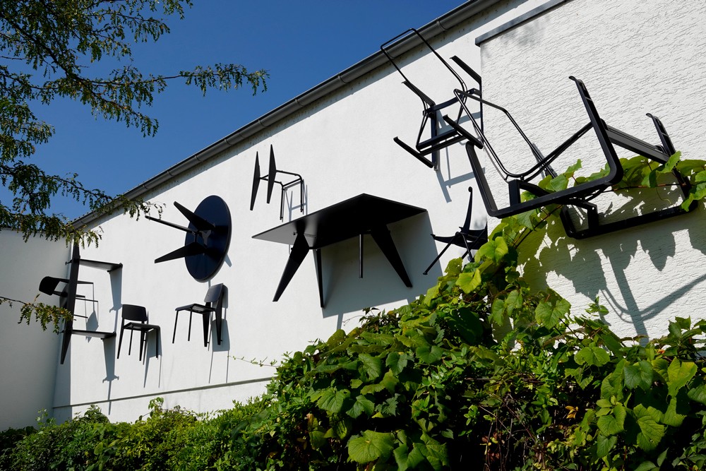Sous un soleil de plomb, on marche jusqu’au bout du campus où se trouvent les ateliers de l’usine, ainsi que le bâtiment Vitra Schaudepot qui, grâce à sa façade dépourvue de fenêtres, conserve les meubles les plus fragiles de la collection dans une atmosphère tempérée. Nous ne visitons pas cet espace, et préférons faire une pause à l’ombre de la place Jean Prouvé, aménagée et décorée par du mobilier réalisé par le designer.