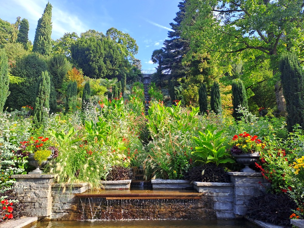 Dès 7h30, nous sommes sur les vélos et pédalons vers Insel Mainau, une petite ile du Bodensee à la végétation luxuriante et dotée d’un jardin botanique d’exception. Trouver notre chemin est très facile, nous ne circulons que sur pistes cyclables et petites routes tranquilles, avec un excellent fléchage. C’est donc avec une petite demi-heure d’avance que nous parvenons à destination ! Une fois les vélos parqués, nous pénétrons dans le parc à 8h45, sous un ciel encore légèrement voilé. Et c’est parti pour une plongée dans le monde somptueux du végétal, même en cette fin d’été…