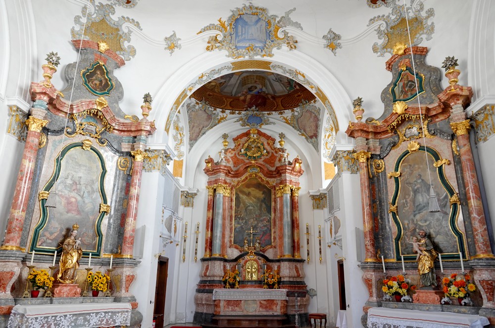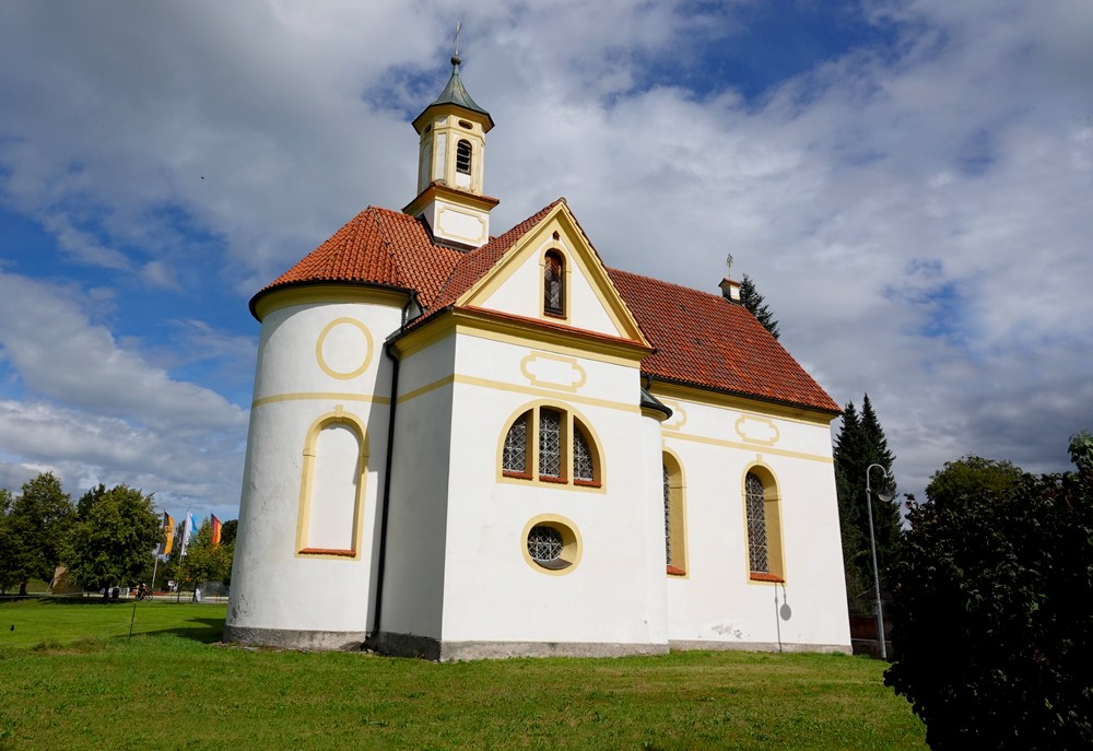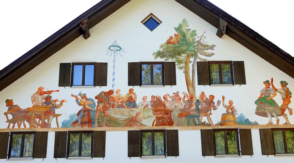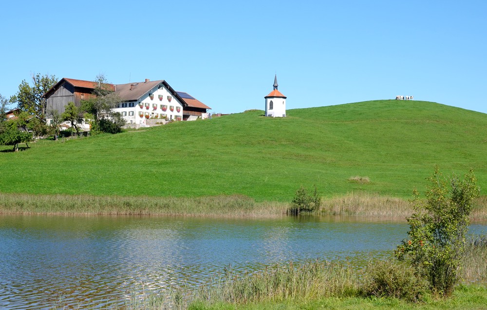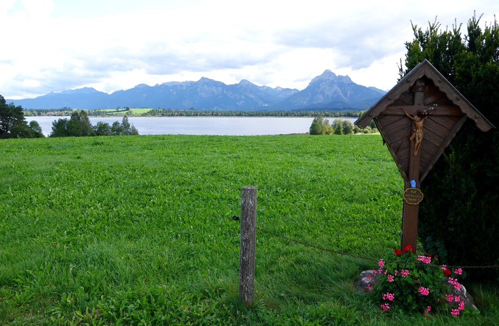 Malgré la grisaille ambiante – et même quelques gouttes – nous n’avons pas pu nous empêcher de reprendre les vélos pour un ultime tour dans les environs. Nous repartons donc d’abord vers l’Hopfensee que nous suivons un petit moment avant de bifurquer vers Hopferried. Ça grimpe fort, mais l’effort en vaut la peine ! L’itinéraire se poursuit ensuite dans la campagne et traverse des hameaux aux maisons bien décorées.