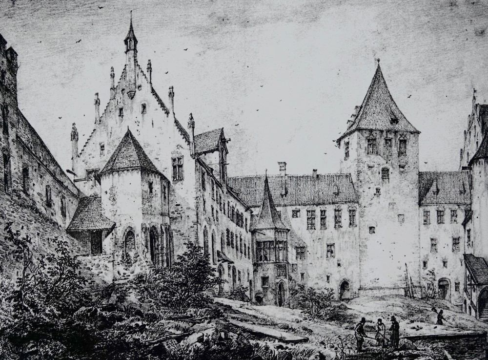 Nous repassons devant le château – dont nous avons déjà visité les intérieurs il y a quelques années – et maintenant la lumière éclaire particulièrement bien les briques rouges de la majestueuse façade est. Vraiment, avoir eu l’idée de construire un tel château, dans un style roman tardif du début du XIIIe siècle, montre à quel point Louis II de Bavière était un personnage excentrique, doté d’un caractère fantasque. A la fin de sa courte vie – il est mort à 40 ans – il ne quittait plus guère le château, ne sortant que la nuit vêtu de costumes historiques. À la suite d’un coup d’État du gouvernement en 1886, il est déclaré fou et s’éteint le lendemain de son internement.