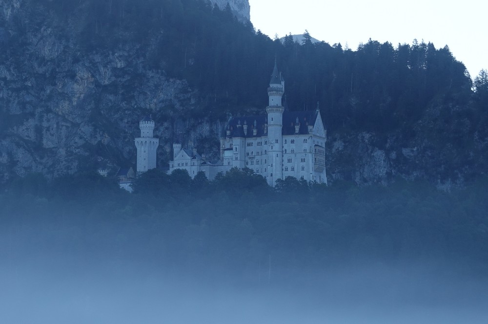 De très bon matin – c’est-à-dire à 7h30 – nous partons à vélo à Hohenschwangau, le quartier de Schwangau où sont édifiés les deux célèbres châteaux de Louis II de Bavière. Le fléchage cycliste est impeccable et trente minutes plus tard, nous parvenons à bon port, après un petit détour dans la campagne pour un premier coup d’œil panoramique… embrumé !