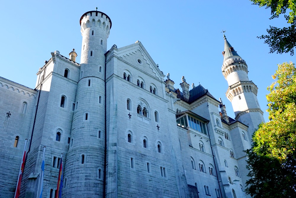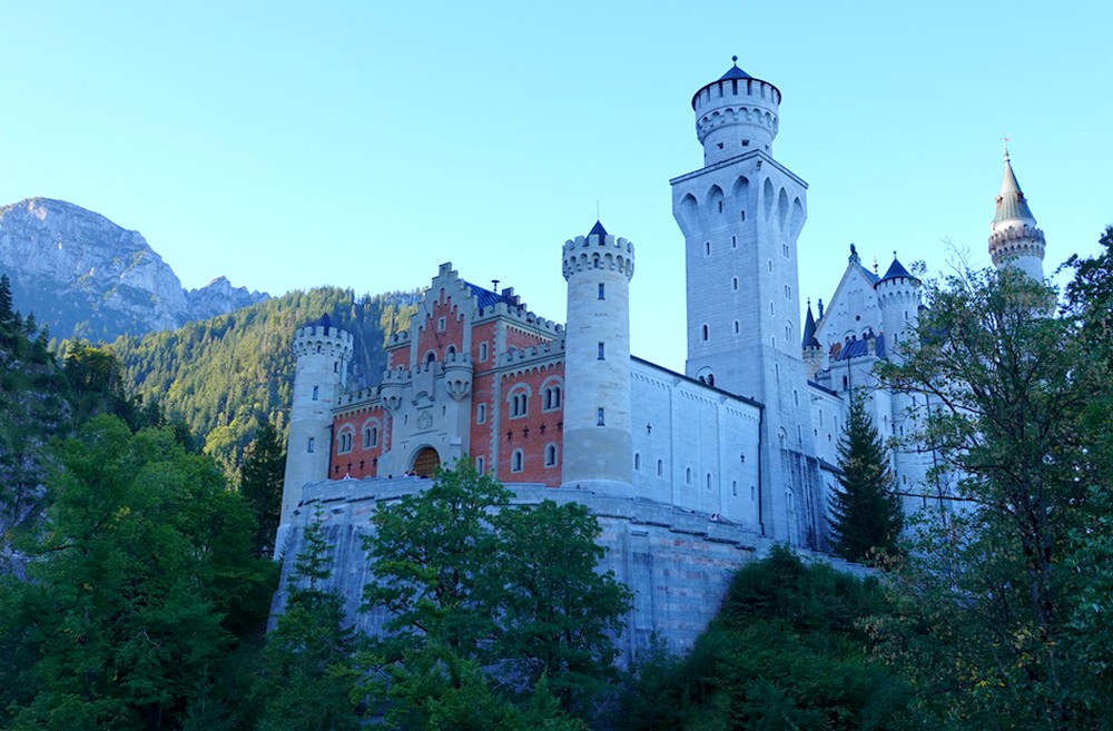 Après une demi-heure de montée, nous arrivons devant la grille du château encore fermée. Le bâtiment, construit entre 1869 et 1886 à la demande de Louis II de Bavière sur un éperon rocheux de 200m, est impressionnant, mais bizarrement, il nous donne l’impression d’être plongés dans un décor de cinéma… Pas étonnant que Walt Disney se soit inspiré de son architecture pour créer le château de la Belle au Bois dormant dans ses parcs à thème !