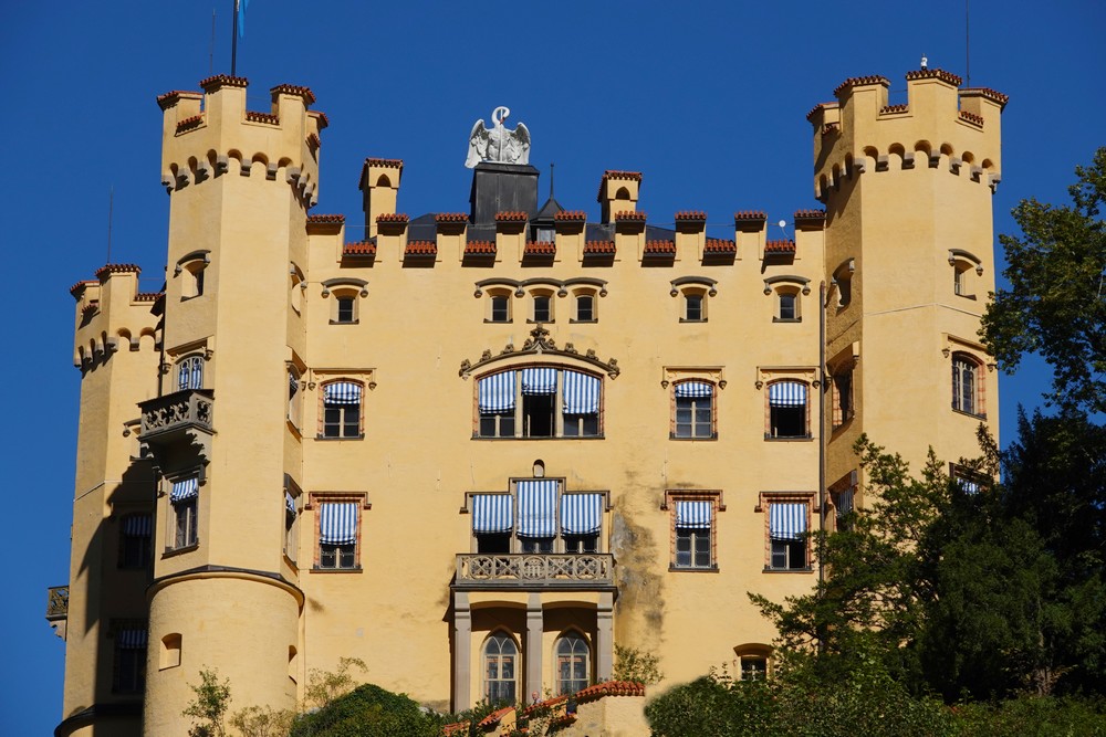 Plutôt que de reprendre le sentier de la montée, nous suivons le chemin emprunté par les carioles – pratique pour ceux qui veulent éviter le dénivelé. Nous débouchons ensuite face au Château de Hohenschwangau, rénové dans un style néogothique en 1837 par Maximilien II, le père de Louis II. Dès lors, il devient la résidence d’été à la famille royale de Bavière et leur sert également de pavillon de chasse.