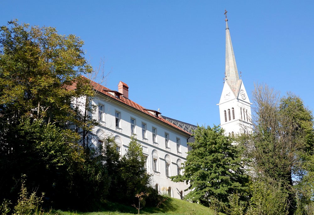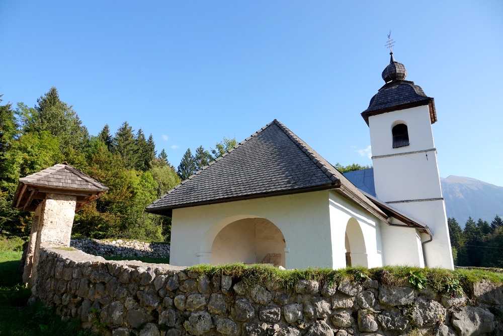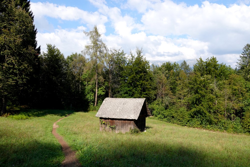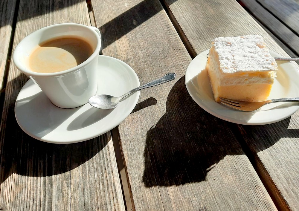 Trente minutes de transpiration plus tard, nous débouchons devant la petite église de Santa Katerina. Après l’effort vient le réconfort, car ce qui retient surtout notre attention ici, c’est l’Okrepčevalnica Jurček, un petit resto qui, dès 9h30, propose, entre autres, de délicieux kremšnitas, un gâteau composé de crème pâtissière et de chantilly, LA meilleure gourmandise slovène et l’un des symboles gastronomiques de Bled !