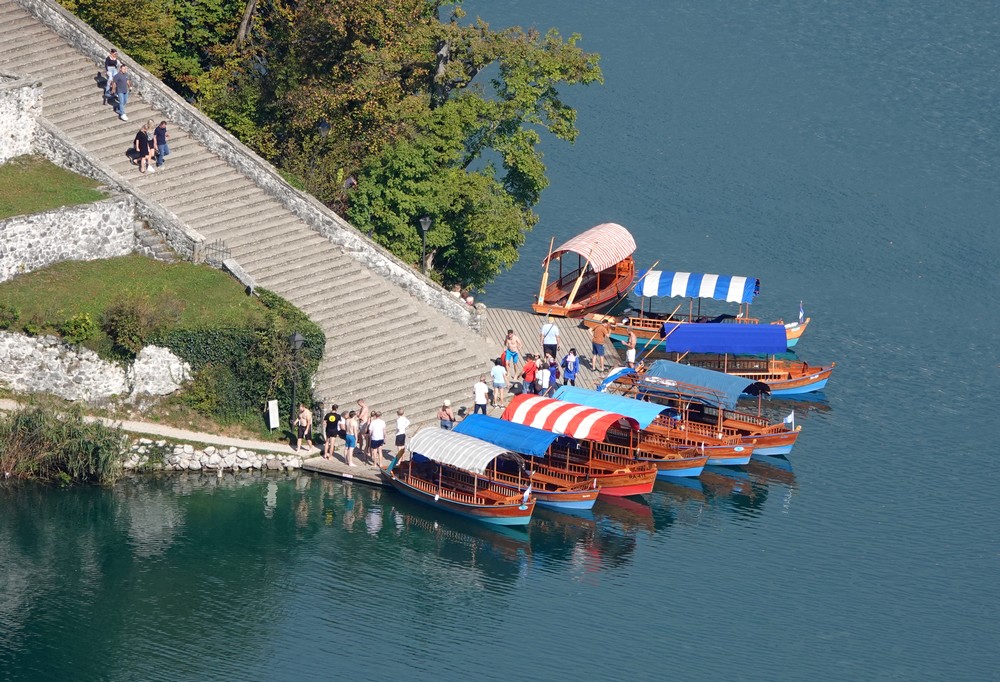 Pour accéder à ce minuscule bout de terre, la plupart des visiteurs embarquent dans une pletna, une sorte de grosse gondole manœuvrée à l’aide de deux rames, et dont les origines remontent à 1590. Autrefois, les droits de propriété de ces bateaux revenaient aux paysans qui recevaient les terres les plus pauvres à cultiver, et le titre de rameur de pletna se transmettait de génération en génération. On peut aussi rejoindre l’ile en louant une barque individuelle – ce que nous avions fait il y a 7 ans.