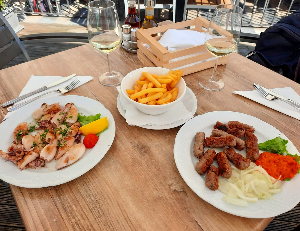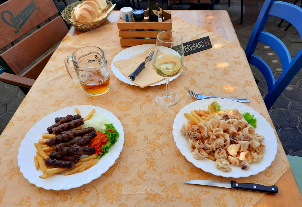 Ayant prévu de déjeuner à Izola, les pieds dans l’eau ou presque, nous reprenons les vélos et rebroussons chemin. Le village est charmant, avec son église haut perchée et son très agréable bord de mer où nous nous posons pour déguster nos plats slovènes préférés : calamars frits et ćevapčići !