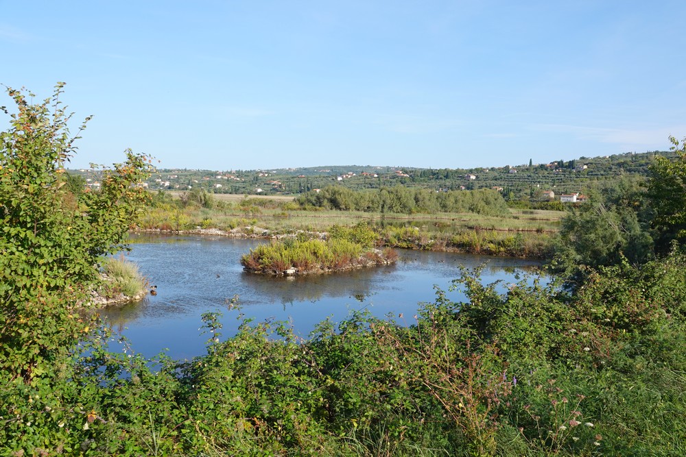 Le changement de pays se fait sans contrôle, et c’est maintenant sur une piste plutôt caillouteuse que nous évoluons, qui monte en surplomb du fleuve Dragonja. L’itinéraire suit le tracé de l’ancienne ligne de chemin de fer qui reliait Trieste à Poreč. Inaugurée en 1903, la ligne fut abandonnée avant la Seconde Guerre mondiale, les conditions de voyage étant éprouvantes tant pour le conducteur du train – forte déclivité, passages délicats – que pour les passagers qui devaient parfois marcher à pied à côté des wagons durant les sept heures que durait le voyage. Il y a quelques années, la vieille ligne en friche a été reconvertie en voie verte, pour le plus grand plaisir des cyclistes et des piétons !