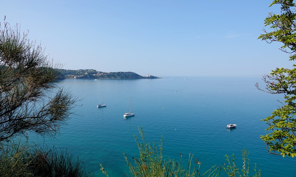 Comme il est bon d’alterner les activités, c’est à pied que nous réalisons cette jolie balade ! Nous partons du camping, et après avoir traversé la saline, nous rejoignons le complexe hôtelier de Strunjan. C’est ici que se situe l’attaque du Nature Trail, une boucle didactique agrémentée de 15 panneaux explicatifs sur les écosystèmes traversés. Après une petite grimpette facile, on parvient au sentier côtier qui longe le littoral à flanc de falaise. Immanquablement, le regard est attiré par l’église de Piran…
