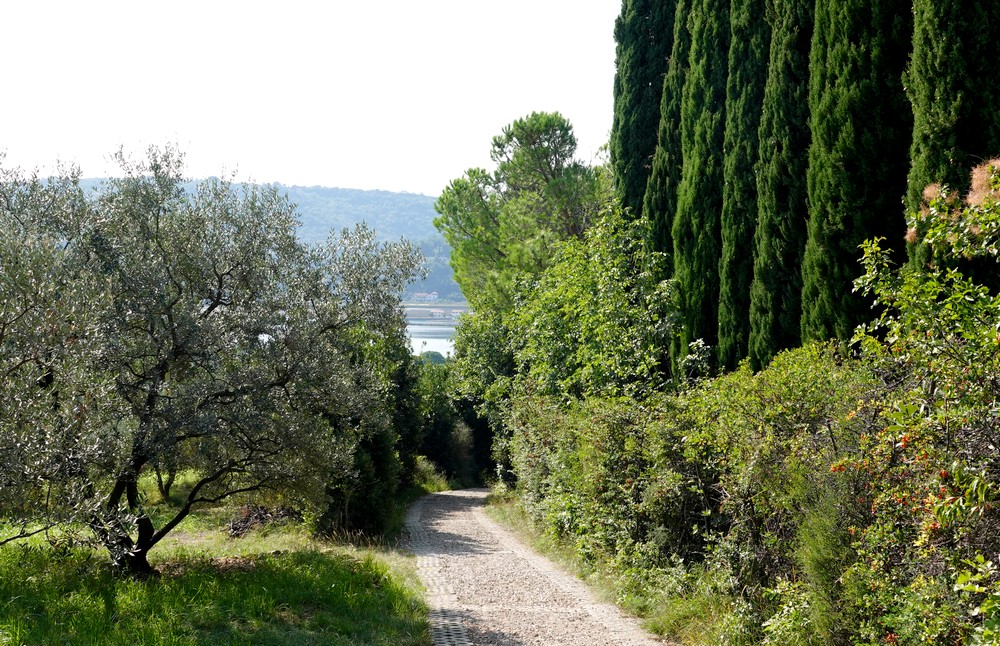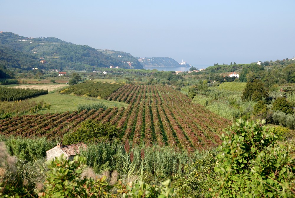Mais on ne descend pas jusqu’au port car le chemin bifurque maintenant à travers vergers et champs pour retrouver Strunjan, sa plage et sa saline.