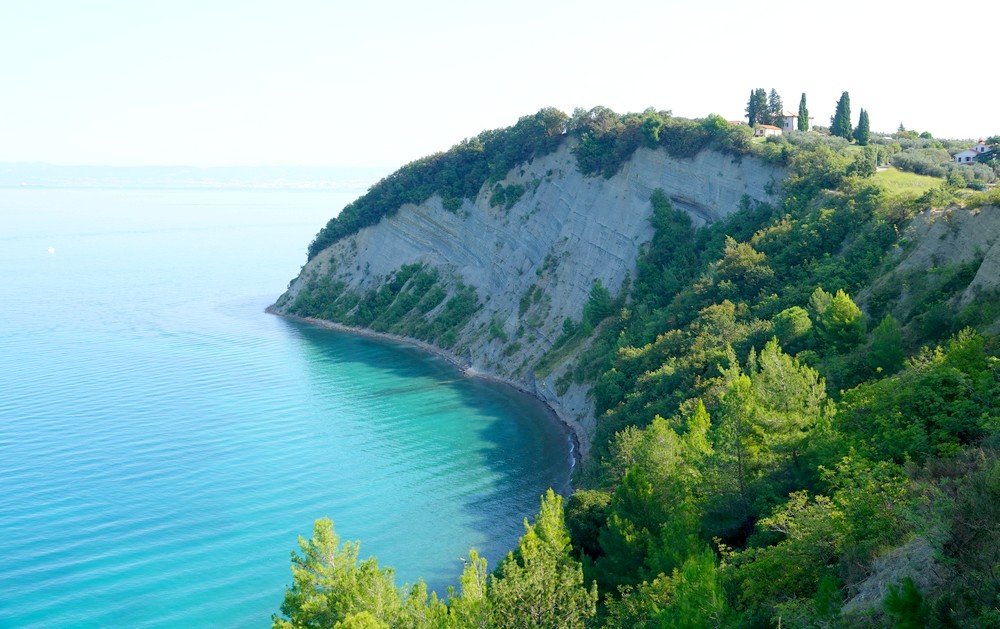 Allez, on referme cette page d’histoire, et on reprend les vélos ! Plutôt que de revenir à Strunjan par la piste cyclable principale – celle empruntée le matin – nous suivons un itinéraire bis qui s’élève le long du littoral jusqu’au belvédère Jagodje. Une fois de plus nous ne regrettons pas l’effort de la montée car la vue est digne d’une carte postale !