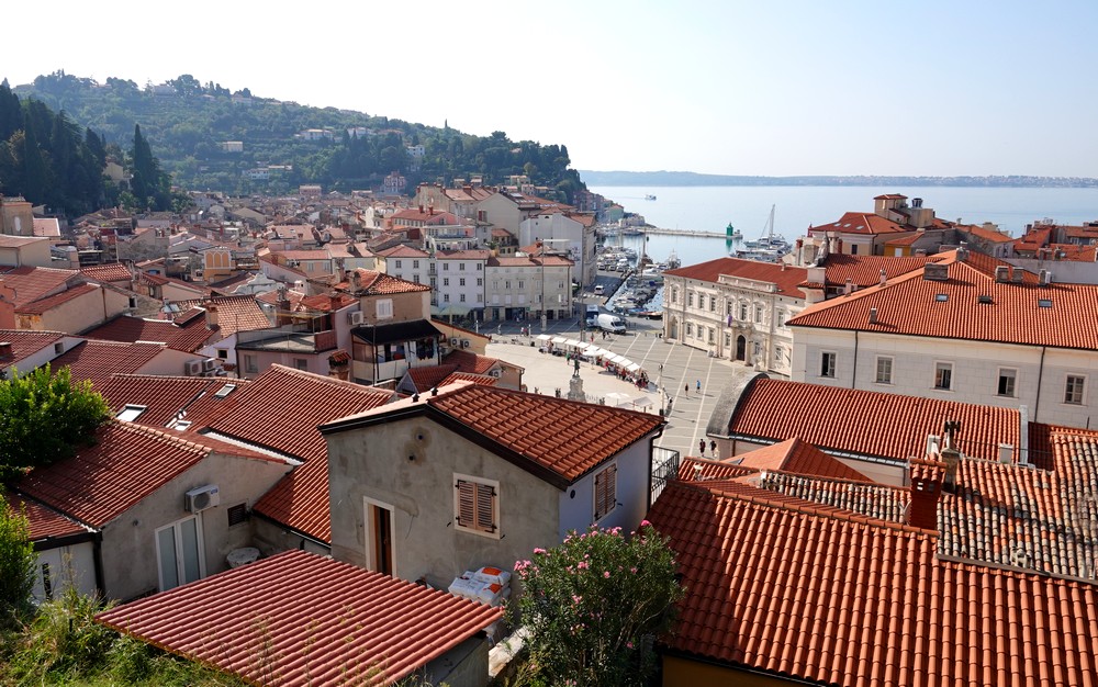 L’arrivée à Piran est saisissante, avec une vue plongeante sur les toits de la ville depuis le belvédère du château – un paysage qui justifie la grimpette depuis Strunjan !