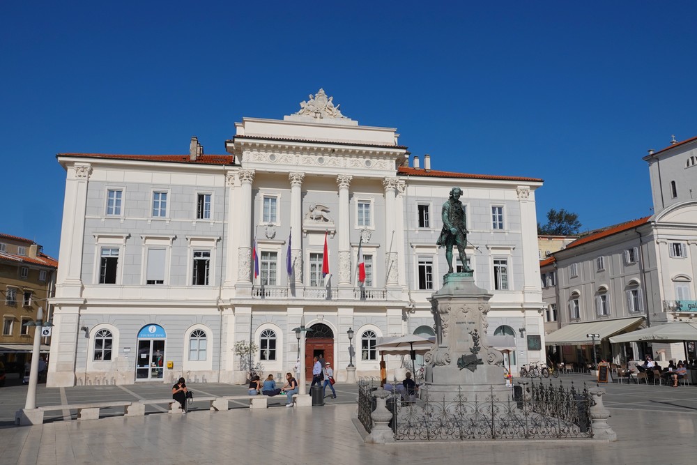 Nous débouchons après sur la Place Tartini, incontestablement la plus belle de la ville par sa forme ovoïde très originale et sa vaste superficie ! Posée face à l’Hôtel de Ville, la statue de Giuseppe Tartini rend hommage à ce violoniste et compositeur, né à Piran en 1692…