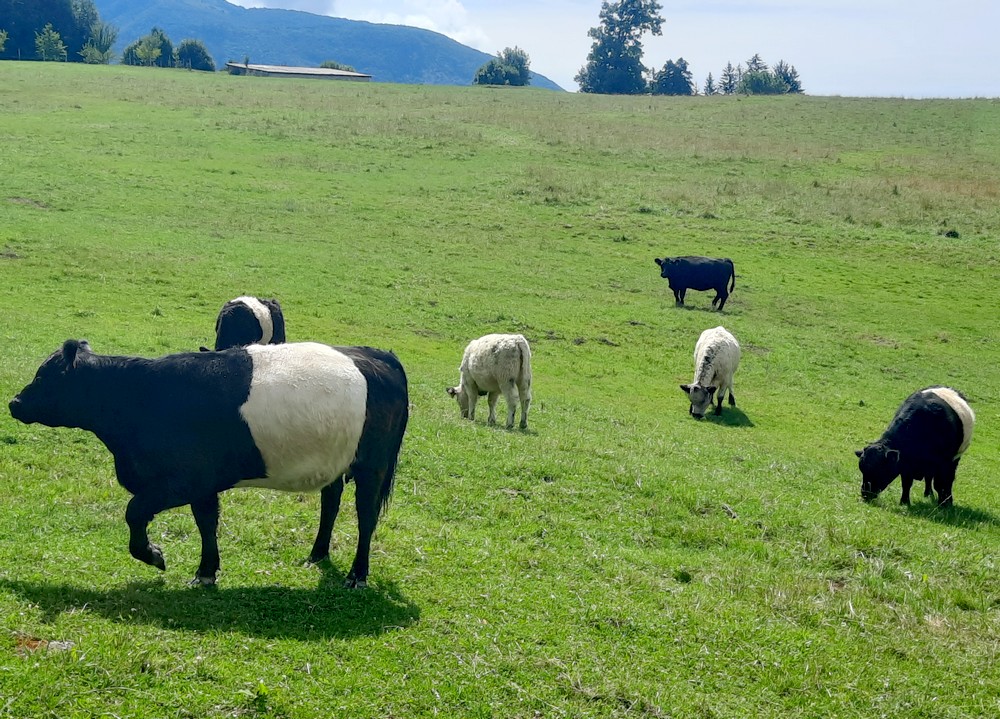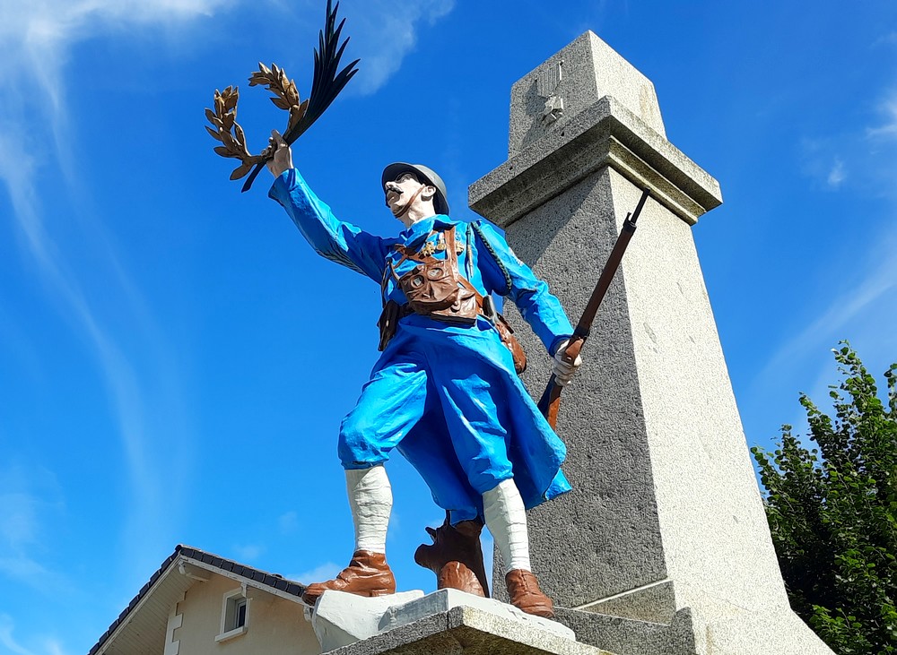 Encore quelques coups de pédales et nous atteignons le col de la Lèbe ! Nous poursuivons jusqu’à Cormaranche-en-Bugey, un village situé sur le plateau d’Hauteville, et dont le monument aux morts nous interpelle par ses couleurs… Il ne nous reste qu’à rebrousser chemin – nous zappons Hauteville-Lompnes – et dans la descente avons la surprise d’observer des vaches bicolores au pelage très particulier !