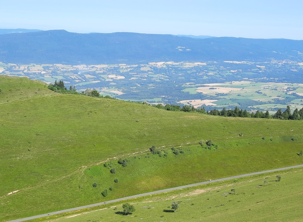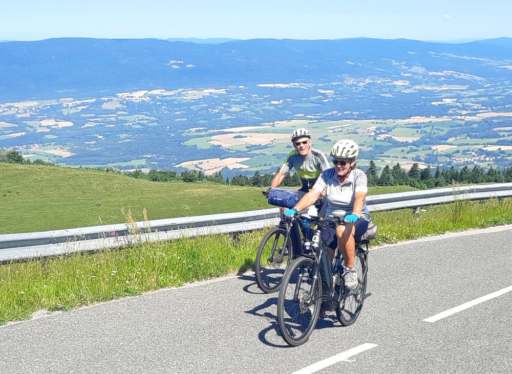 Tous les amateurs de cyclisme connaissent ce mont mythique haut de 1534m, tant de fois gravi par les coureurs du Tour de France ! Plusieurs routes y montent, la plus connue étant celle qui part de Culoz, dans la plaine. Étant basés à Champagne, nous optons pour l’itinéraire qui passe par Lochieu, bien ombragé et doté d’une pente moyenne à 7%. Malgré cette faible inclinaison – très relative quand on n’est pas un pro – ce n’est pas un parcours facile, une portion de route affichant même un beau 13.5% ! Et même avec mon vélo à assistance électrique, je trouve les trois derniers kilomètres – de 9% à 10% – interminables, tandis que Gérard, à vélo musculaire, monte comme une fleur : chapeau !