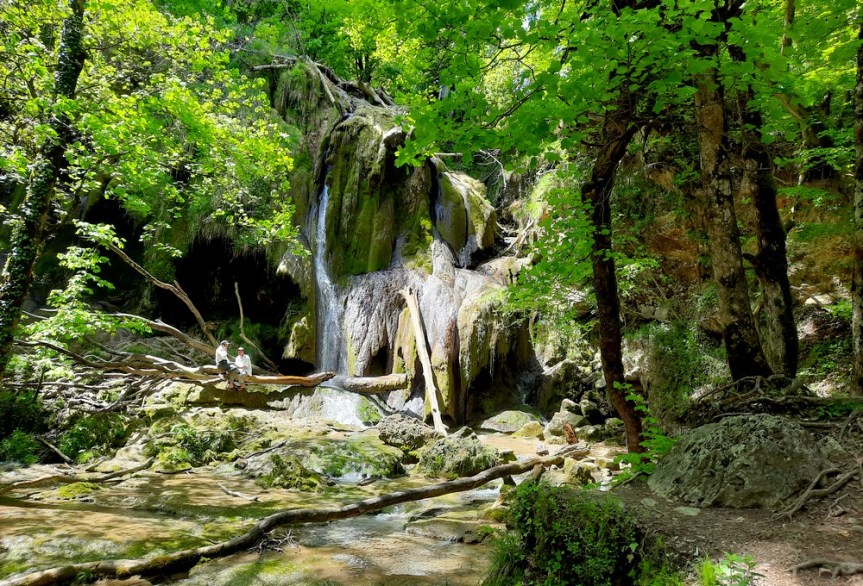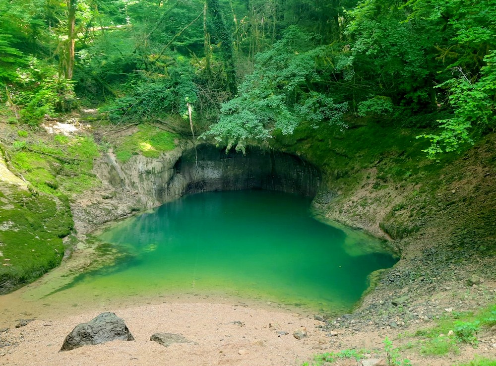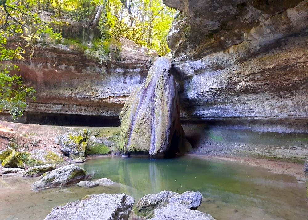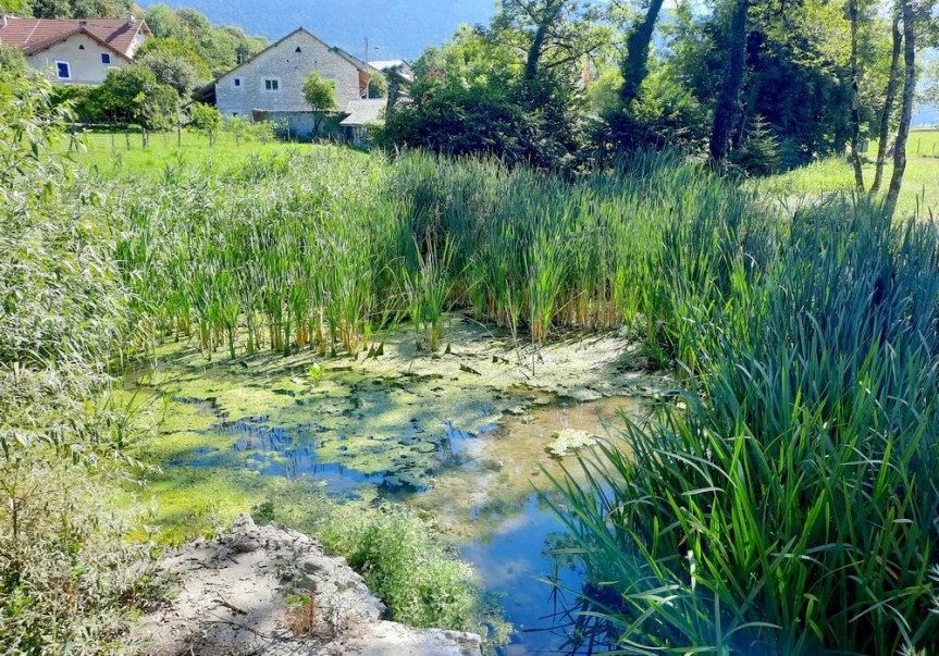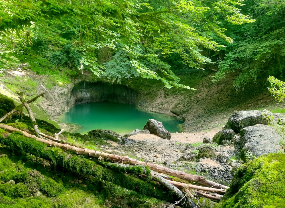 Nous pédalons ensuite jusqu’au hameau de Vaux-Morest situé à l’est de Chongnes ; là, nous garons les vélos et poursuivons à pied jusqu’à la source du Groin, une curiosité géologique du Valromey. Il s’agit d’une source vauclusienne, autrement dit de la résurgence d’une rivière souterraine, à la façon des eaux de la Fontaine de Vaucluse. La vasque où l’eau ressurgit de façon intermittente, s’ouvre sur une dizaine de mètres dans du calcaire valanginien. La source est l’exutoire d’un siphon karstique de plus de 2 200 mètres de long et 40 mètres de dénivelé. Le réseau dont elle fait partie draine les eaux du plateau du Retord et du Haut-Valromey. Lorsque le siphon s’amorce, une remontée d’eau jusqu’à 15 mètres peut s’effectuer et le débit peut atteindre 30 m3/s. (source https://chasseautresor.ain.fr/enigmes-et-solutions/enigme-5/solution/la-source-du-groin/)