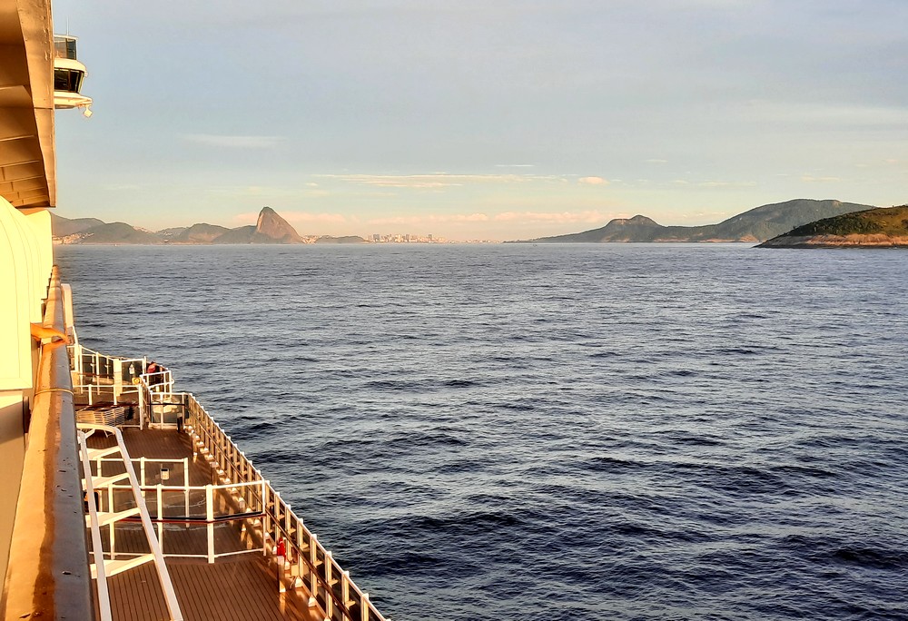 Notre belle croisière s’achève le jeudi 7 novembre… A l’aube, le Seaview pénètre dans la baie de Rio, et sous un pâle soleil, nous apercevons avec plaisir le fameux Pain de Sucre, et plus loin le célèbre Corcovado… Vers 7h, le bateau accoste ; de notre balcon, nous avons une superbe vue sur les docks…