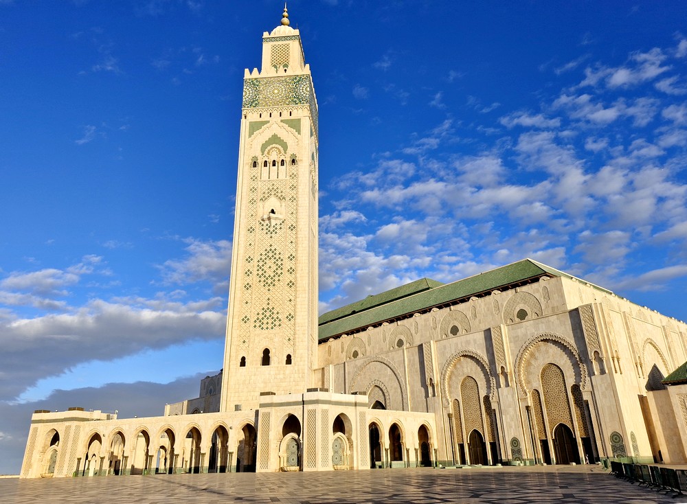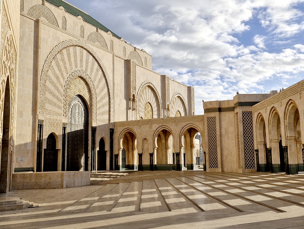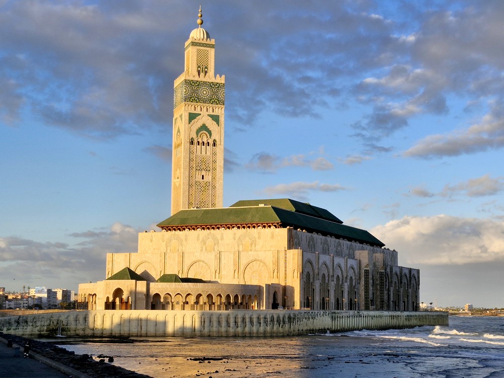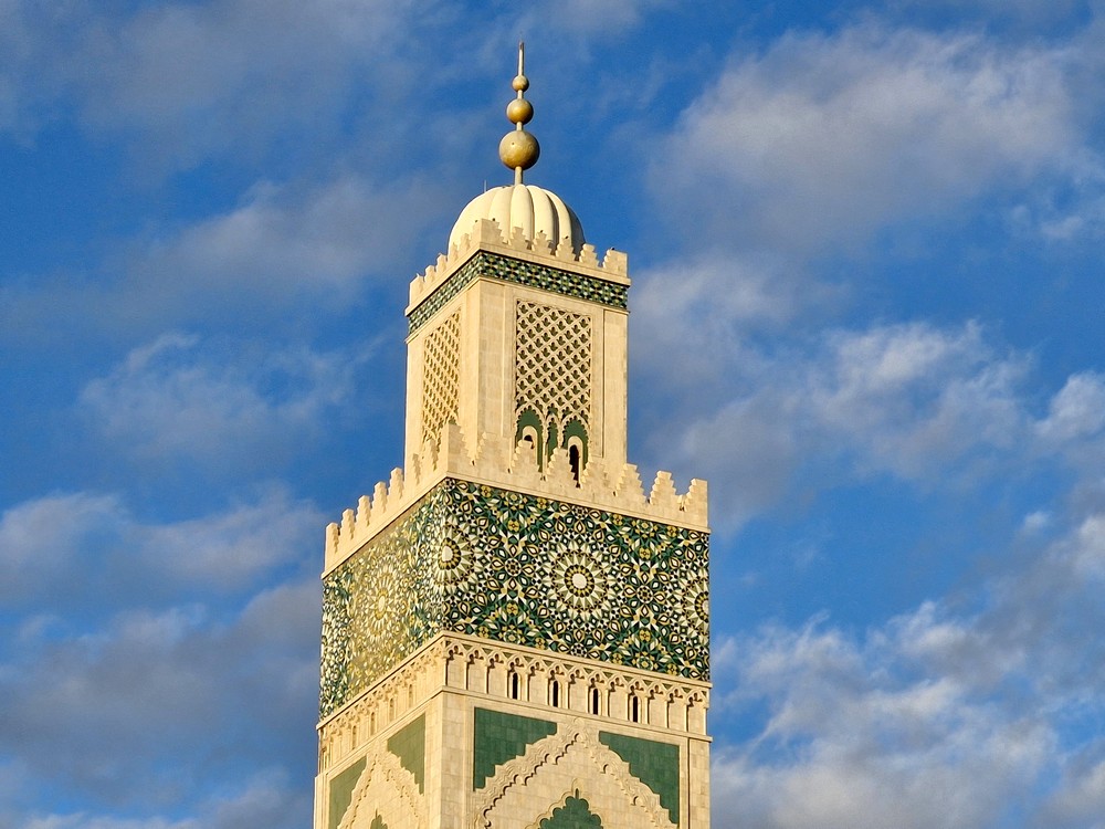 Après de nouveau une journée et deux nuits en mer, la deuxième escale se fait au Maroc, à Casablanca. Le bateau a accosté dans la nuit, et dès 6h, nous sommes debout, prêts à débarquer vers 7h. Comme presque toujours, nous sommes les premiers à poser le pied à terre, et c’est d’un bon pas que nous nous dirigeons vers la sortie du port – une petite trotte d’environ deux kilomètres ! Sans faiblir, nous poursuivons jusqu’à la Mosquée Hassan-II.