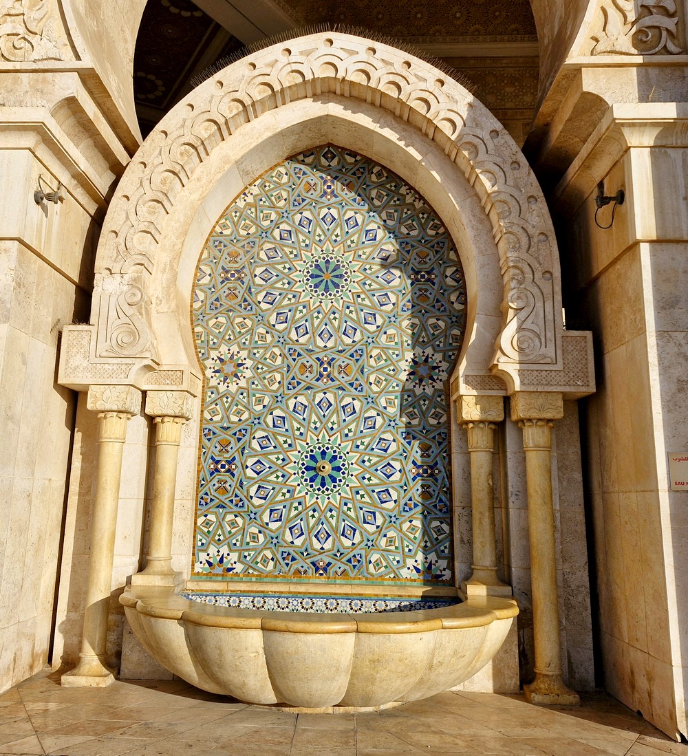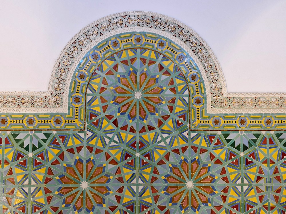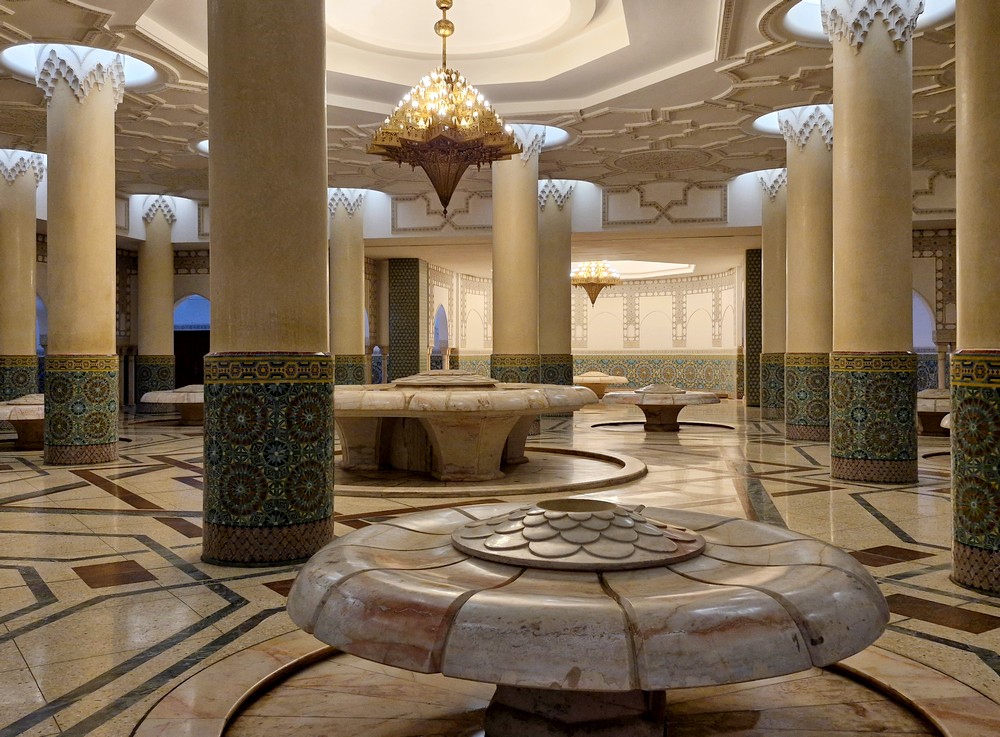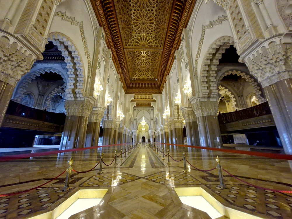 L’intérieur est somptueux, il faut dire que la réalisation des décors et ornementations a nécessité 50 millions d’heures de travail, impliquant l’engagement de 11.000 cadres permanents. Parallèlement, cette entreprise a engendré la création de près de 80.000 emplois indirects, des artisans ayant été recrutés dans toutes les villes du royaume. Mais ce qui frappe surtout nos esprits, c’est le gigantisme des lieux – la salle de prière peut accueillir 25.000 personnes… Bref, pour quiconque apprécie l’architecture et l’artisanat local, cette visite est un incontournable !