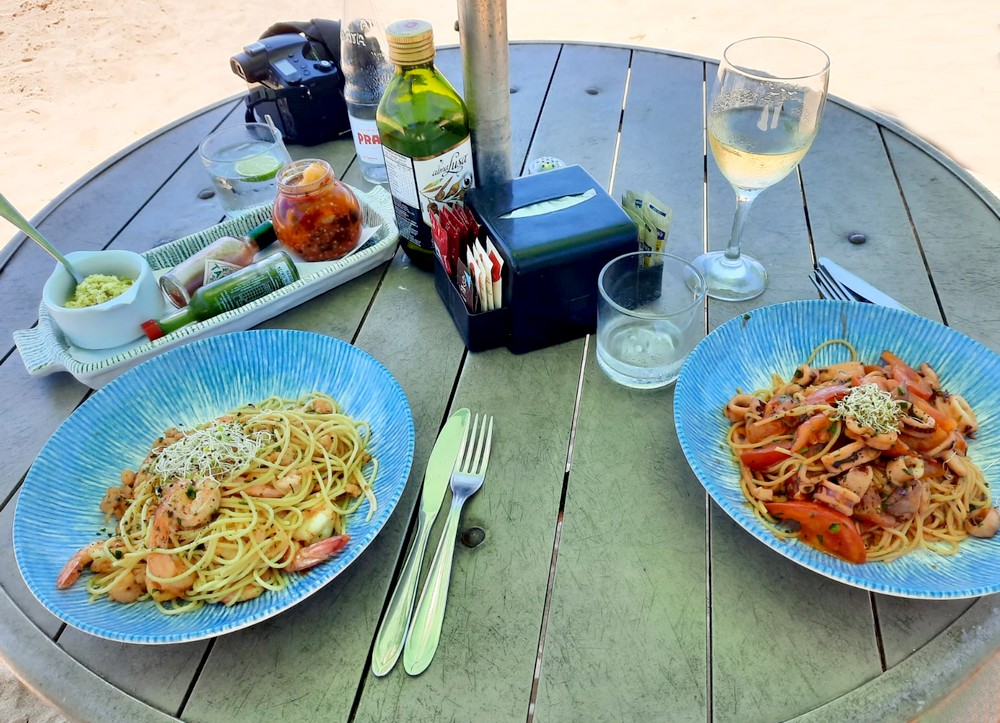 Midi approchant, nous nous posons au Pimenta de Cheiro, un restaurant « pieds dans le sable ». Au menu : spaghetti aux crevettes et spaghetti aux calamars, un régal dégusté dans un cadre exceptionnel !
