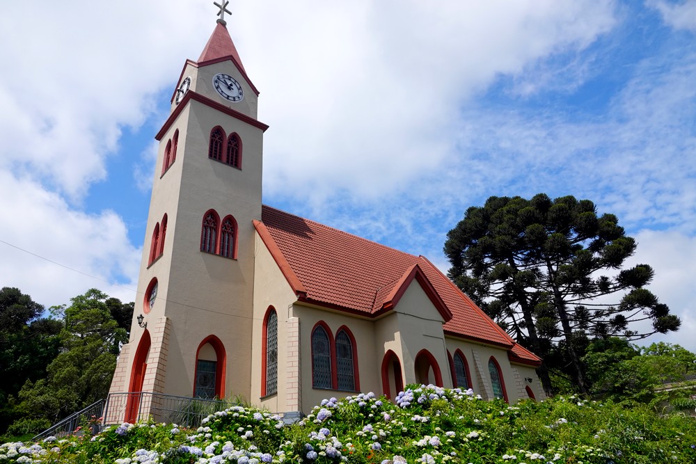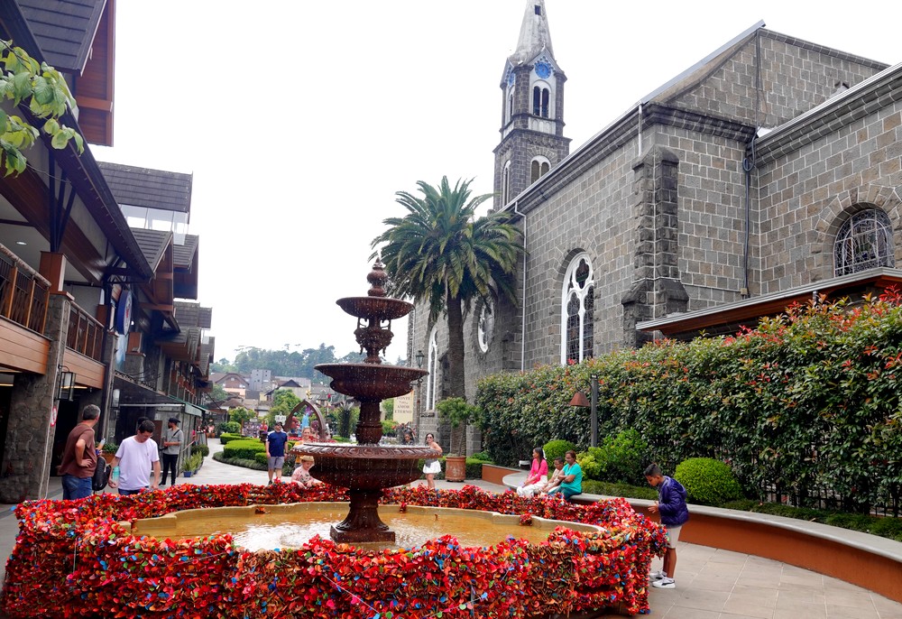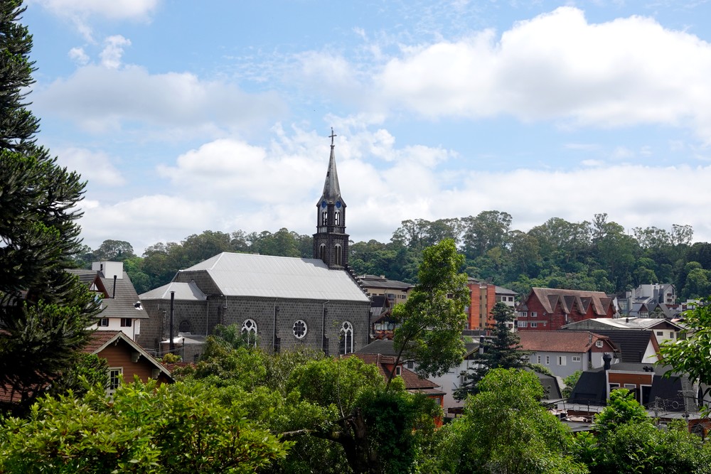 Après une douche rapide, nous filons au centre-ville pour découvrir de plus près ces fameuses décorations de Noël. Côté météo, une fois de plus nous n’avons pas de chance : hormis un unique rayon de soleil prévu entre 10h et 11h ce lundi, la suite du séjour s’annonce brumeuse et pluvieuse… Nous commençons par visiter l’église luthérienne Paulo, joliment installée sur un petit promontoire, puis nous poursuivons avec l’église principale São Pedro qui se repère de loin grâce à son clocher qui culmine à 46m de haut. Bâtie en 1917 en bois, c’est en 1943 qu’elle est reconstruite en pierres de basalte. D’un point de vue historique, Gramado fut fondée par des colons brésiliens en 1875 ; puis à partir de 1913, des descendants d’Allemands, d’Italiens et de Suisses se fixèrent sur le territoire de l’actuelle commune, d’où l’aspect architectural des lieux.