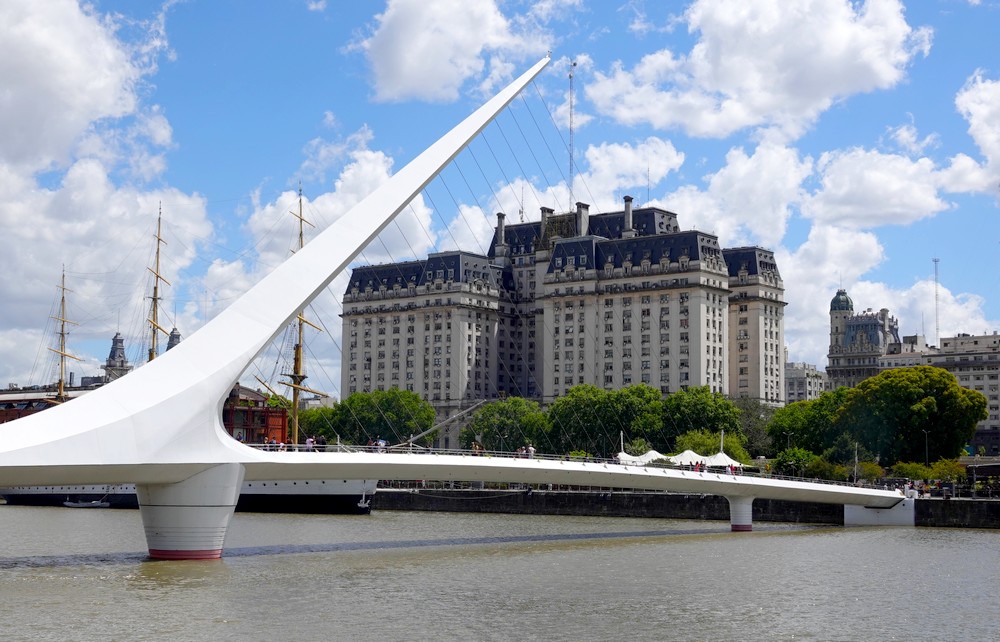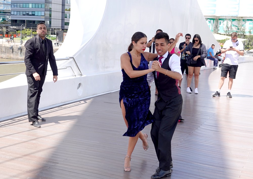 Après un coup d’œil extérieur au centre culturel Kirchner (installé dans l’ancien Palais des Postes), nous poursuivons ensuite vers Puerto Madero, le quartier le plus récent de Buenos Aires. Cet ancien port fut construit en 1882 afin de permettre aux gros bateaux de décharger cargaison et passagers, la faible profondeur du Rio de la Plata les obligeant alors à s’amarrer loin de la ville. Mais dès le début du XXe siècle, avec l’augmentation de la taille des navires, ce port devint obsolète et tomba en ruines. Un gros travail de réhabilitation démarra en 1991, des rues furent tracées, des parcs créés et l’infrastructure historique fut restaurée. Après 20 ans de chantier, le résultat est saisissant, et c’est désormais l’un des quartiers les plus modernes et agréables de Buenos Aires ! La balade est vraiment chouette, et sur la passerelle de la Mujer, on a même la chance d’assister à une belle démonstration de tango…