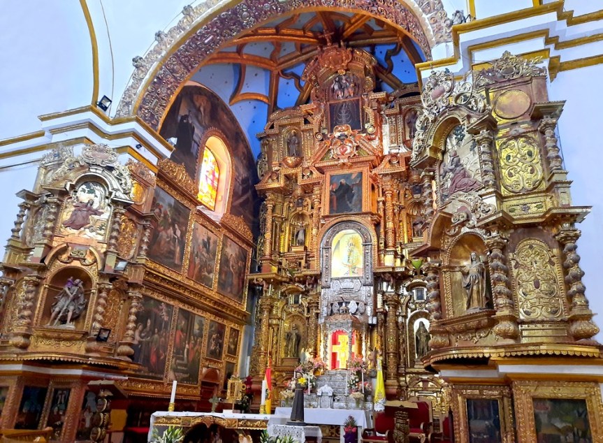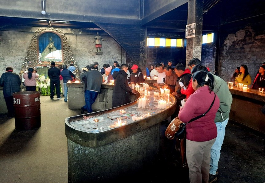 Mercredi, ciel gris et pluie au réveil… On se contente donc d’une balade dans le village, très animé en ce 22 janvier, férié pour commémorer l’adoption de la nouvelle constitution bolivienne en 2010. Après avoir longtemps pensé que le nom Copacabana dérivait de l’aymara kota kahuana signifiant « vue sur le lac », les archéologues ont découvert qu’en réalité Kotakawana était le dieu de la fertilité dans la mythologie andine antique, un dieu androgyne qui vivait dans le lac Titicaca, entouré de sa cour… L’actuelle Basilique Notre-Dame de Copacabana a d’ailleurs été construite à l’emplacement du temple principal de la fertilité de Kotakawana, preuve que la ville était un lieu sacré bien avant la conquête espagnole ! A l’intérieur de l’église, édifiée dans un style morisque entre 1610 et 1651, la foule se presse pour déposer des gerbes de glaïeuls devant la fameuse sculpture de la Virgen de la Candelaria de Copacabana, taillée en 1580 par l’artiste quechua Francisco Yupanqui, neveu de l’Inca Tupac Yupanqui, deuxième empereur historique de l’Empire inca.