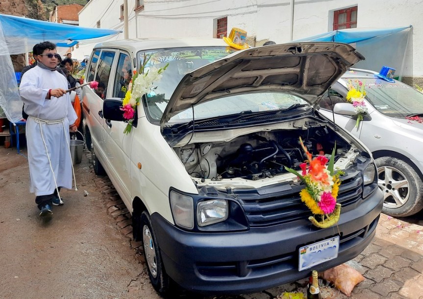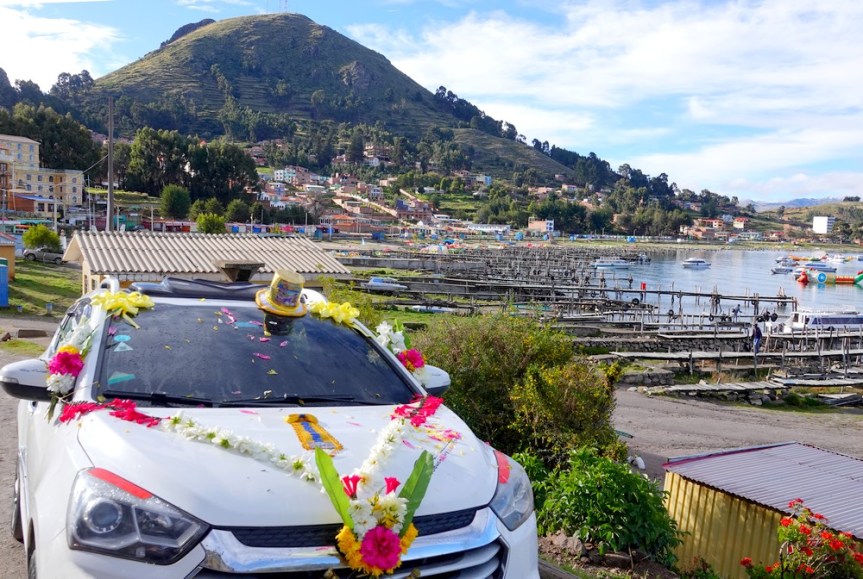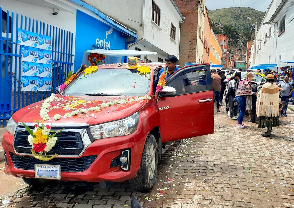 Plus surprenant, derrière la basilique, on tombe sur la cérémonie de la bénédiction des voitures ! En effet, chaque jour entre 10h et 14h, il est possible de faire baptiser son véhicule par un prêtre ; pour que la fête soit parfaite, la voiture doit être décorée de fleurs et de guirlandes, et même arrosée d’un peu de vin mousseux. Ainsi bénie, la voiture sera protégée… et son conducteur aussi – on comprend mieux la conduite très sportive de certains Boliviens, convaincus que leur sort est entre les mains de Dieu et qu’ils peuvent doubler, en haut d’une côte, sans visibilité aucune…