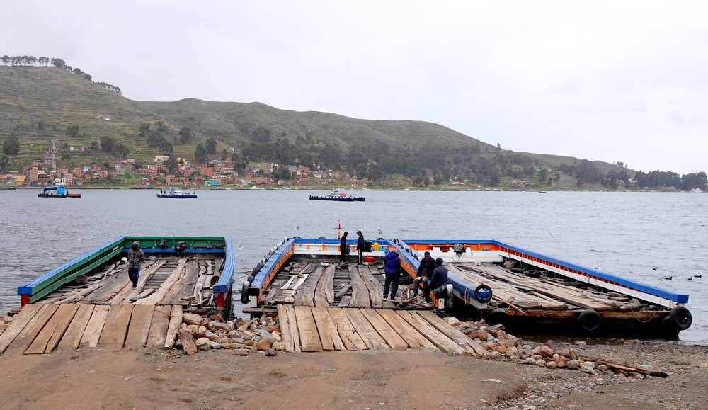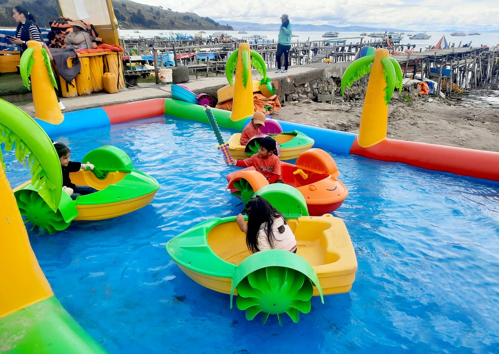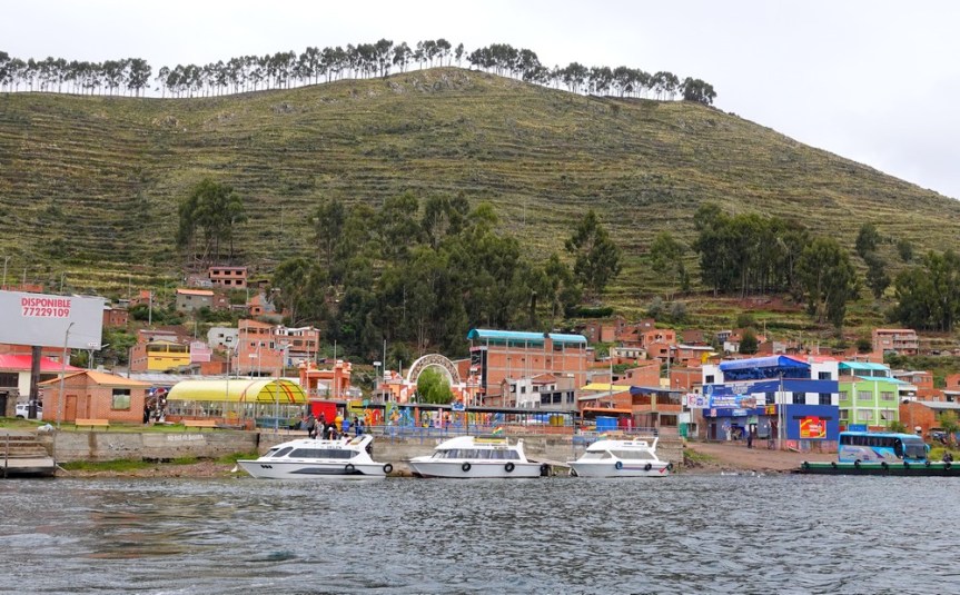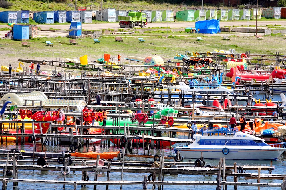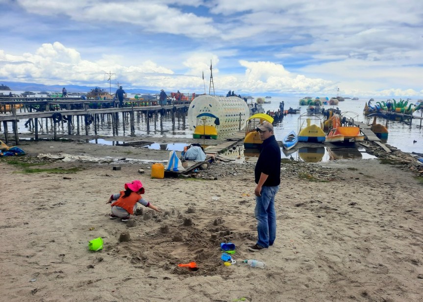 Un peu énervés, nous nous installons tout de même dans la chambre, au demeurant très agréable, puis nous repartons nous balader vers la « plage ». Là encore, mauvaise surprise : le rivage est sale et peu soigné, encombré de structures gonflables tractées par une nuée de petits bateaux à moteur… Décidément, on n’imaginait pas le plus grand lac d’eau douce d’Amérique du Sud ainsi ! D’ailleurs, à cause de l’urbanisation, des ruissellements des mines et de l’agriculture intensive, le lac est actuellement menacé par une sévère pollution : l’eau est chargée de métaux lourds, ce qui entraine la disparition progressive de la faune – notamment la grenouille géante Telmatobius culeus, en danger critique d’extinction.