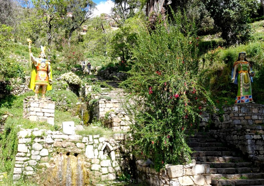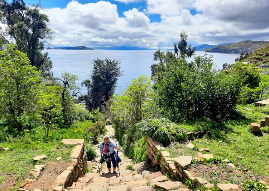Une fois débarqués à Yumani, nous nous dirigeons directement vers l’escalier inca qui compte 206 marches de pierre au relief inégal. Tranquillement, mais sans difficulté, nous montons jusqu’à une fontaine qui assure jeunesse éternelle à qui boira son eau – on a fait un refus, on restera vieux, tant pis !