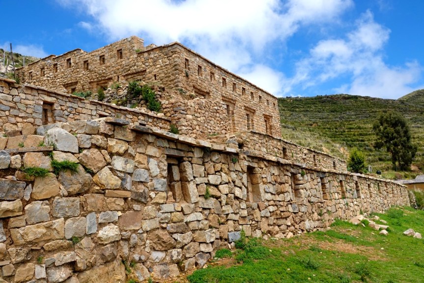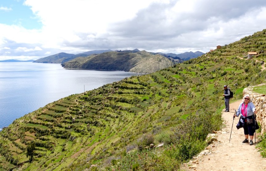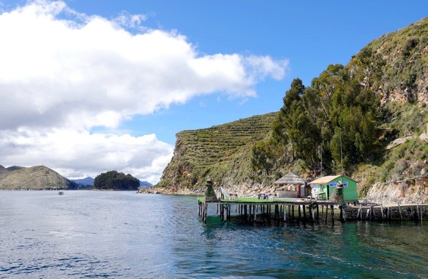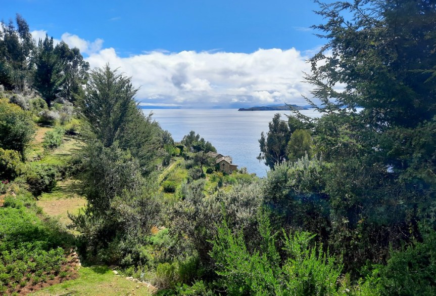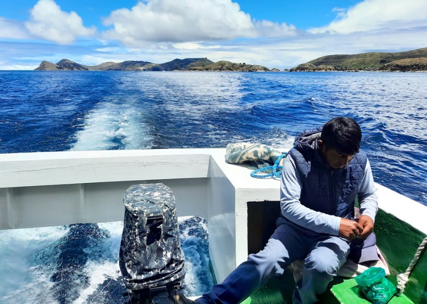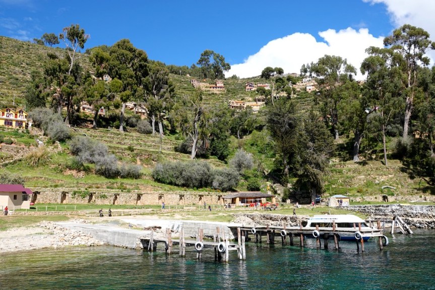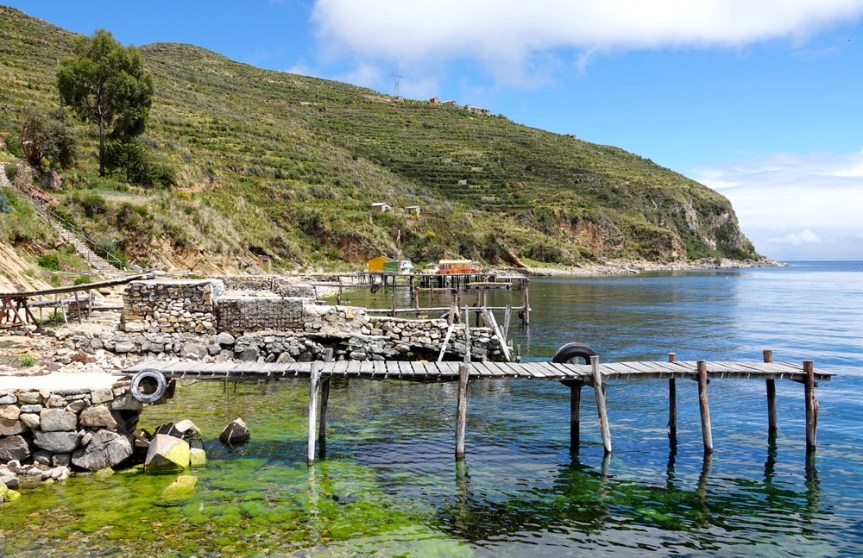 - Navette communautaire Copacabana => Yumani, Isla del Sol, départs quotidiens à 8h30 et 13h30. Retour de Yumani à 11h et 16h (passage 15mn plus tard aux ruines). Durée de la traversée, environ 1h30. Bs.50 l’AR si effectué dans la journée. Possibilité d’opter pour une rando guidée entre Yumani et les ruines, environ 2.5km, 200mD+ dont 206 marches irrégulières en pierre, 1h30, on recommande chaudement cette option (nous avons eu Elmer pour guide, il est très compétent et sympathique), Bs.40.