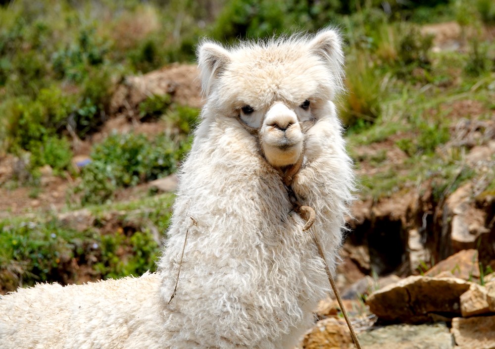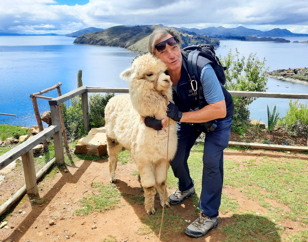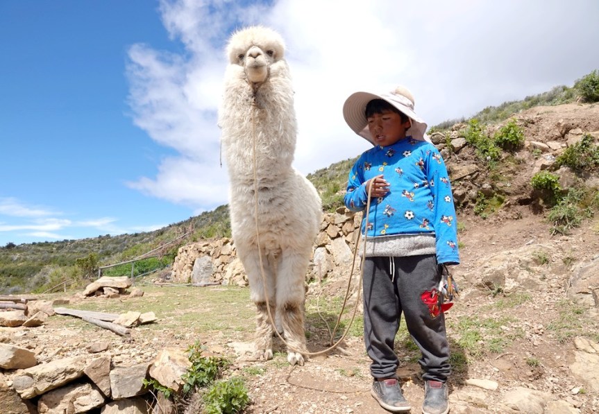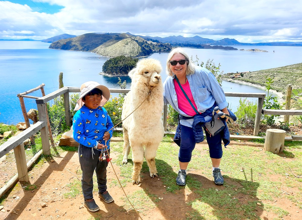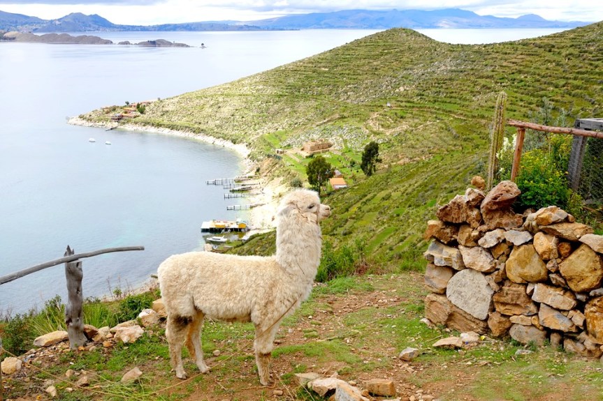 A mi-parcours, nous faisons une halte bienvenue à un belvédère qui surplombe le lac : la vue sur le Temple du Soleil, en contrebas, est magnifique, avec en prime, un alpaga tout mignon qui prend la pause pour la photo !