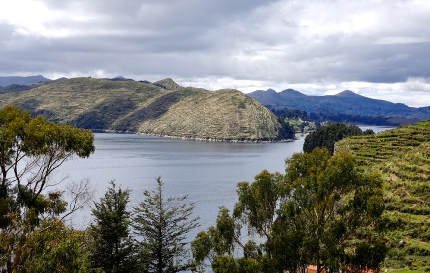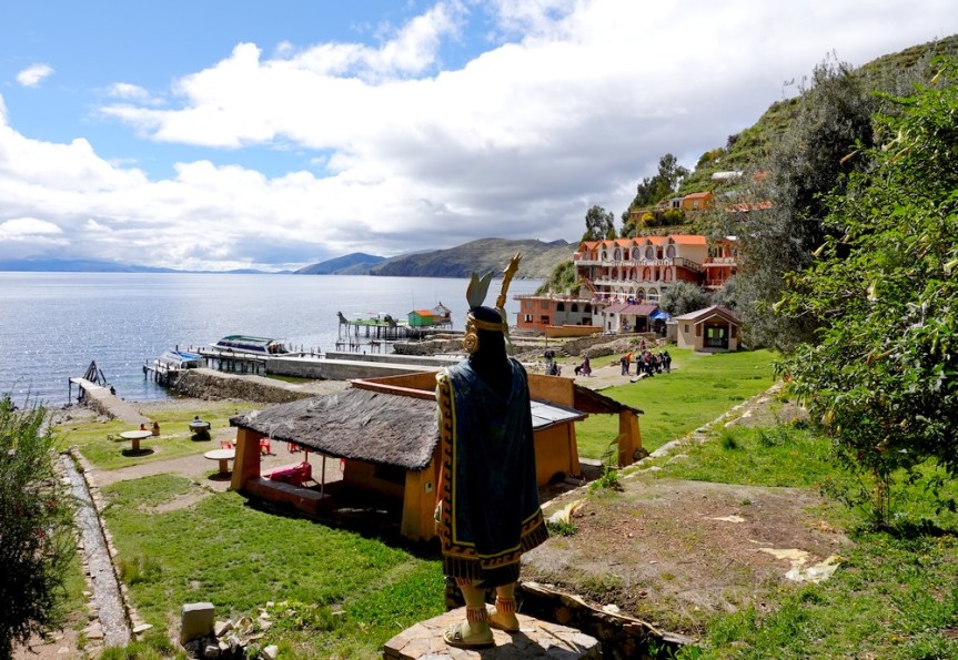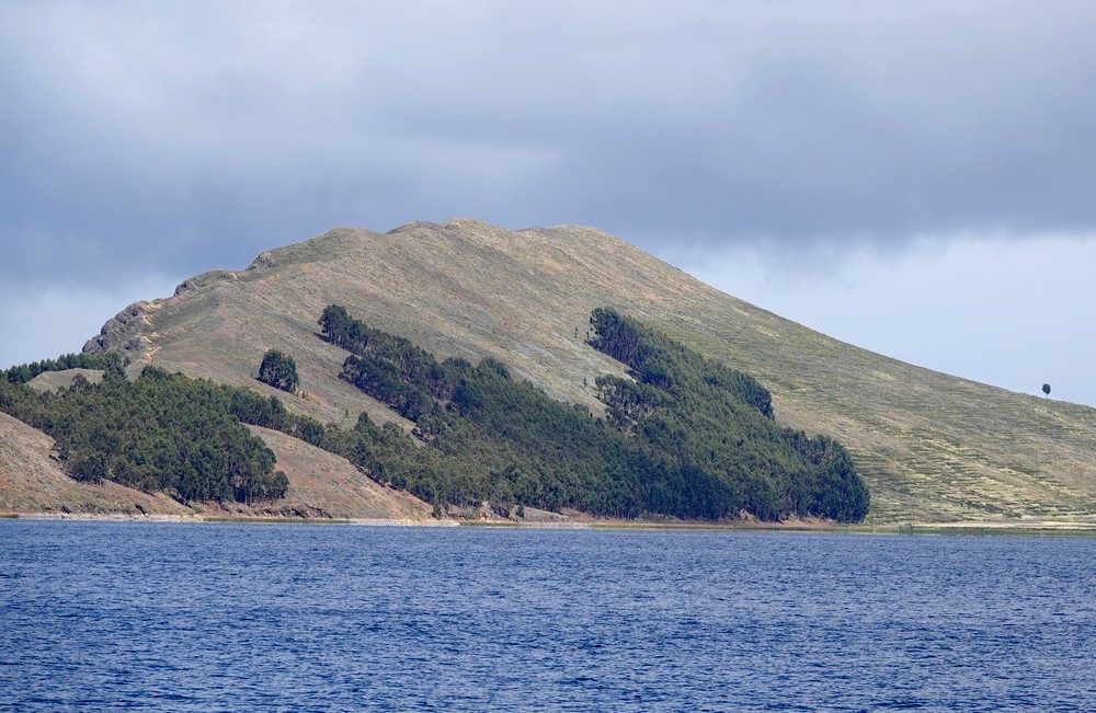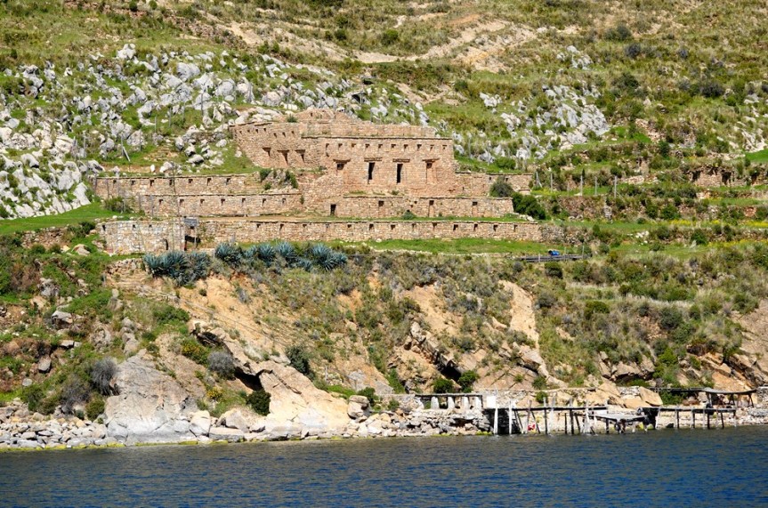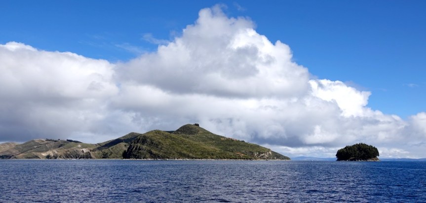 Mardi matin, un timide rayon de soleil illumine les eaux bleues du lac… Nous ne trainons pas, et à 8h30 nous embarquons à bord de la navette régulière qui rejoint Yumani, sur la côte sud de l’Isla del Sol, la plus grande ile du lac, longue de de 9.6km pour 4.6km de large. La traversée dure une heure trente sur une « mer » d’huile – oui, ce lac est si grand que l’on distingue à peine la rive opposée, on se croirait vraiment en bord de mer ! Peu avant d’arriver à destination, nous passons devant le majestueux Temple du Soleil érigé par les Incas vers le XVe siècle de notre ère. Il faut dire que le lac Titicaca – dont le nom signifie Roc du Puma en aymara – fut de tous temps un lieu sacré de la culture andine. Avant même l’Empire Inca, la colonisation espagnole et la christianisation, les iles du lac étaient habitées par les Aymaras, un des peuples autochtones les plus anciens de l’arc andin. Et la légende veut que le dieu Viracocha ait surgi de ce lac, créant ainsi le monde et toutes les civilisations des Andes…