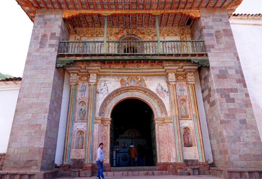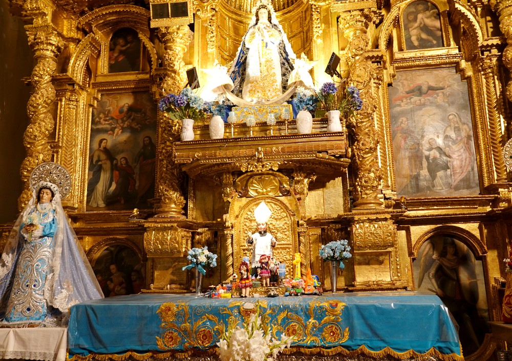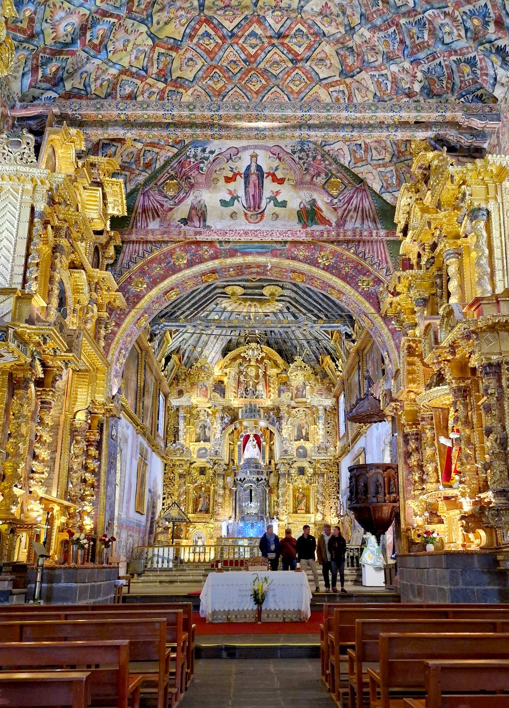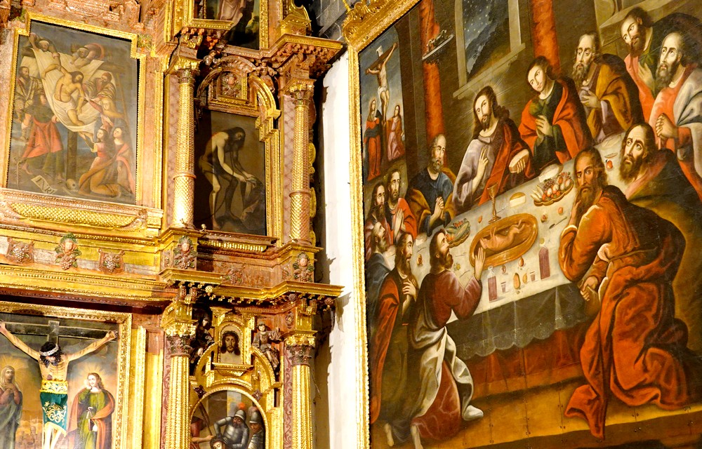 Le dernier arrêt du voyage se fait à Andahuaylillas pour découvrir le joyau du baroque andin : l’église San Pedro Apóstol de Andahuaylillas, surnommée La Chapelle Sixtine des Andes. Construite à la fin du XVIe siècle, son extérieur sobre contraste avec l’exubérance des ornements intérieurs, colorés et parfois recouverts de dorures. La plupart des œuvres sont de Luis de Riaño, un peintre de Lima, et le but de ces représentations religieuses était à la fois d’enseigner le message biblique aux populations indigènes mais aussi de susciter leur adhésion par l’émerveillement. Quelle découverte impressionnante pour nous – assurément l’un des plus beaux édifices religieux de tout notre périple sud-américain !