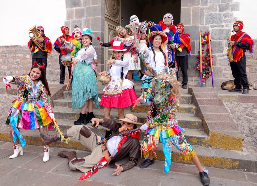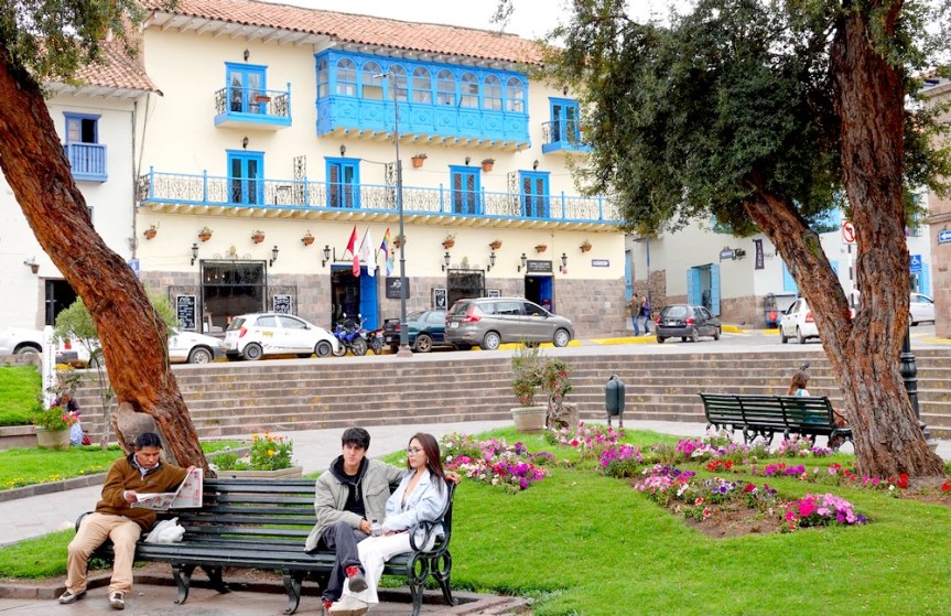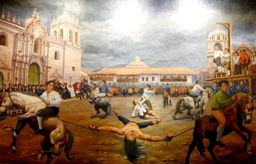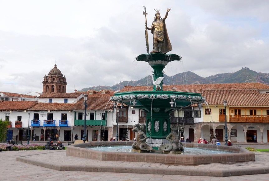 Jeudi matin, notre première balade dans l’ancienne capitale des Incas nous mène naturellement Plaza Mayor, autrefois épicentre politique et économique des différentes civilisations avant l’arrivée des envahisseurs espagnols en 1534. Selon la légende, ce sont Manco Capac et Mama Ocllo, sa sœur et épouse principale, tous deux nés des eaux du lac Titicaca, qui auraient installé la dynastie inca à Cusco. Quant au nom de la ville, deux étymologies prédominent : il pourrait s’agir du « rocher de la chouette » attribué par les Aymaras ou bien du « nombril du monde » donné par les Incas, mais pour l’heure, les historiens n’ont encore pas tranché. À l’époque de l’Empire Inca, la place – bien plus grande qu’aujourd’hui – était un important centre administratif, religieux et culturel. Toutes sortes de cérémonies y étaient organisées et les victoires de l’armée inca y étaient fêtées. Après la conquête espagnole, elle fut remodelée et bordés d’édifices catholiques, construits sur les ruines des anciens palais incas. Sur cette place, Túpac Amaru II fut exécuté en 1781, ainsi que plusieurs autres héros de l’indépendance du Pérou.