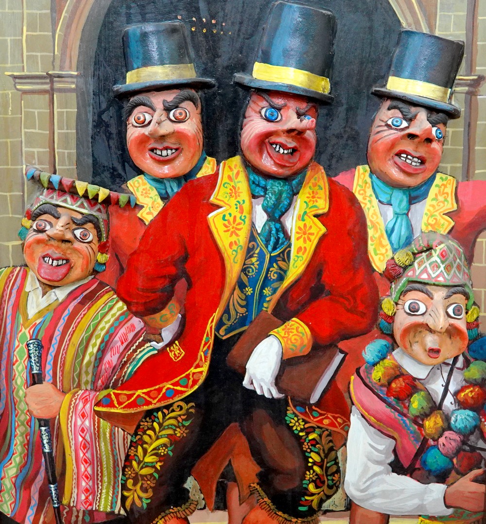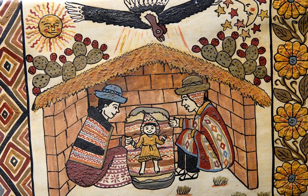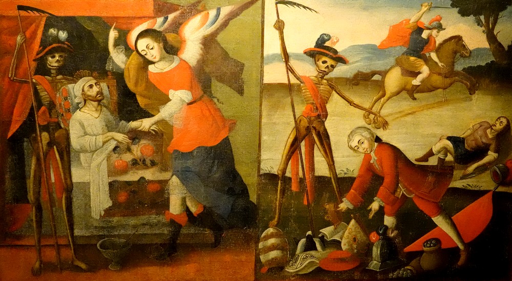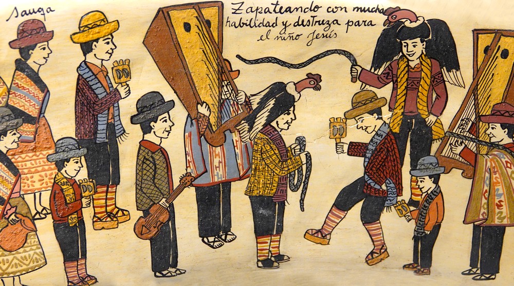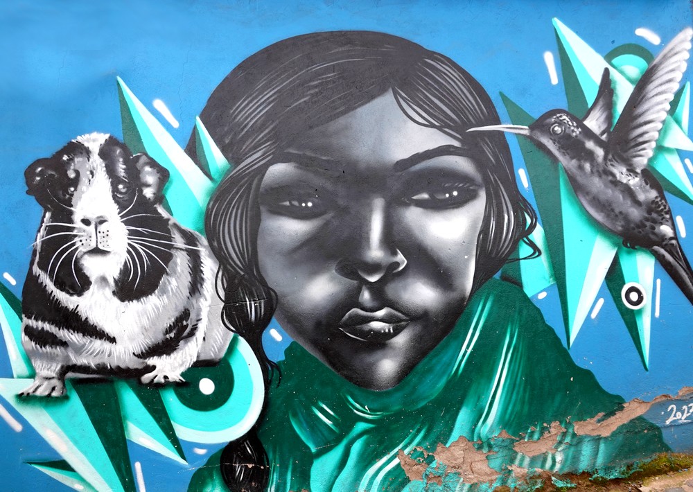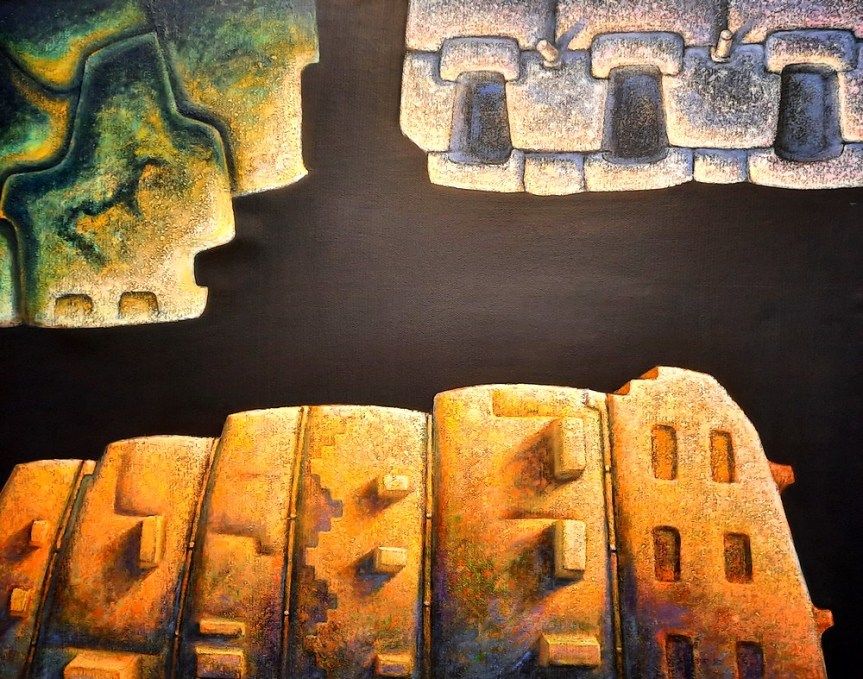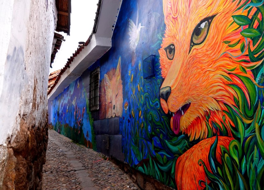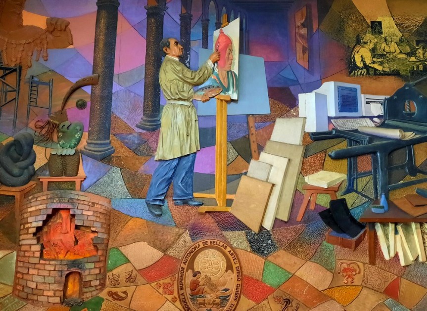 De retour en ville, nous nous baladons une dernière fois dans les rues qui bordent la Plaza Mayor. Dans la Calle Marques – agréable car piétonne – nous tombons sur l’Université nationale d’Art Diego Quispe Tito et sur une galerie qui, toutes deux, présentent plusieurs œuvres intéressantes qui rappellent les sites visités…