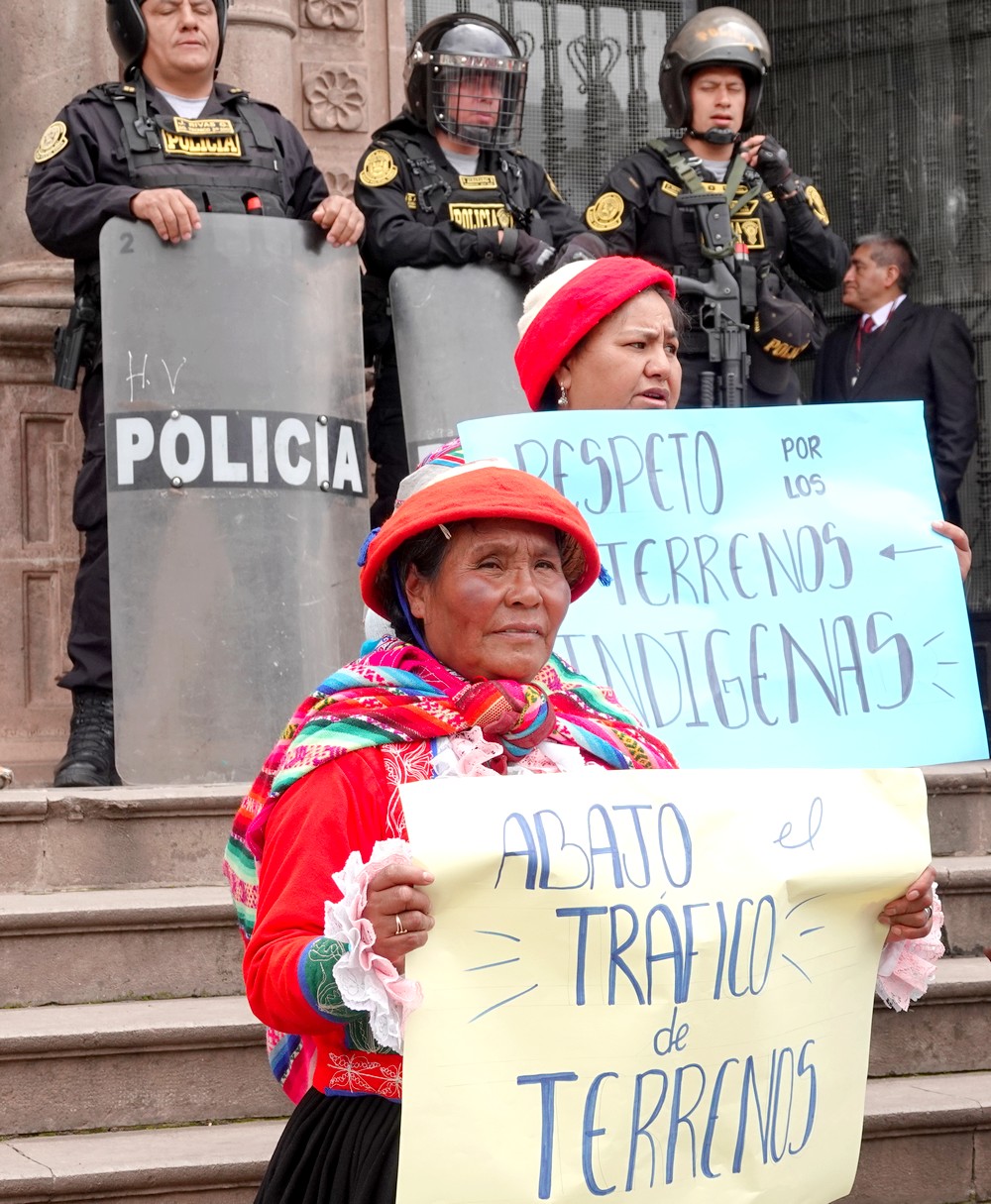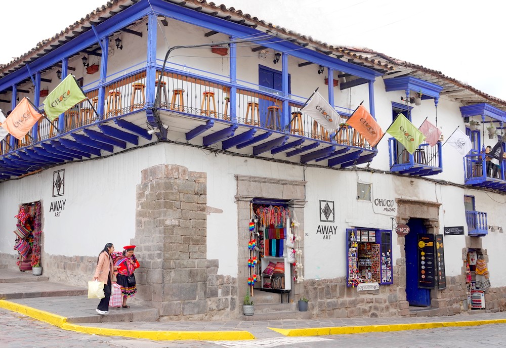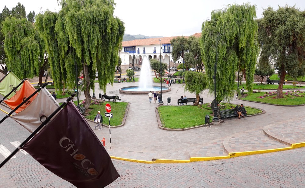 Après ces deux premières visites, il est temps pour nous d’aller acheter le Boleto turistico qui, dix jours durant, nous permettra de visiter sites archéologique et musées, non seulement dans la ville mais également plus loin, dans la Vallée Sacrée. On prend donc la direction de l’avenida El Sol, sorte de Champs Elysées locaux, bordés de banques et bâtiments administratifs. Cette artère est très animée, d’ailleurs on assiste à une manifestation d’Andins réclamant la fin du trafic des terres des indigènes. Une fois nos billets en poche, nous remontons vers la Plaza Regocijo, une jolie place située derrière la Plaza Mayor. Là, nous déjeunons au restaurant Yaku – bons plats mais très chers pour le pays – et on complète le repas par une visite au ChocoMuseo qui, outre une vue sur l’atelier de production, offre surtout une belle gamme de chocolats péruviens et propose divers desserts dans son salon de thé – la mousse au chocolat et la tarte au chocolat sont très bons !