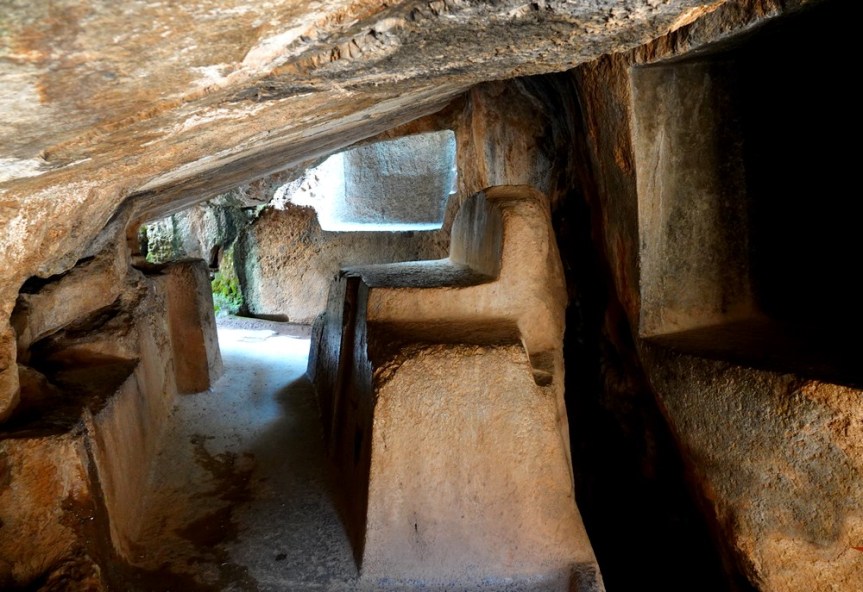Autre particularité du site : les deux chincanas. Il s’agit de tunnels ou de grottes souterraines servant à relier différents lieux. D’après certains mythes locaux, plusieurs personnes s’y sont aventurées, mais n’ont jamais trouvé la sortie… Ces grottes auraient aussi, parait-il, servi à connecter la forteresse au Machu Picchu, à Qoricancha et à d’autres endroits. L’un de ces tunnels étant ouvert au public, nous nous y sommes engouffrés : une expérience particulière, car même si le boyau n’est pas bien long, on est vite plongés dans un noir absolu bien angoissant…