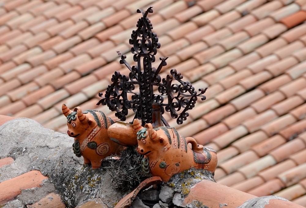 Pour rejoindre Cusco depuis Puno, nous optons pour un trajet en bus touristique afin de gagner un peu en confort : une excellente idée qui permet aussi de découvrir plusieurs sites d’importance sur la route… A 6h30 du matin, nous embarquons donc dans un bus quasiment neuf de la compagnie Inka Express ; à notre grand étonnement, nous sommes juste deux couples à participer à ce voyage, accompagnés par Juan-Carlos, le guide, et Mauro, le chauffeur ! Nous quittons les rives du Titicaca sous une belle pluie, mais heureusement, deux heures plus tard, quand nous parvenons à Pucará, le ciel s’est bien éclairci. La ville, fondée 1800 ans avant JC, était à l’époque le plus grand centre urbain de la région – ce fut même la première cité de ce secteur de l’Altiplano – favorisé par le développement de l’agriculture et les élevages d’alpagas. Mais c’est surtout l’art de sculpter la pierre qui fait l’originalité de la culture Pucará, comme on peut le voir au musée de la ville. Après la colonisation espagnole, l’église Santa Isabel fut édifiée par des missionnaires jésuites, en 1767 – plusieurs couples d’ibis mandore y ont actuellement élu domicile ! De nos jours, la renommée de Pucara vient surtout des petits taureaux en terre cuite placés sur le toit des maisons pour attirer la bonne fortune sur le foyer…